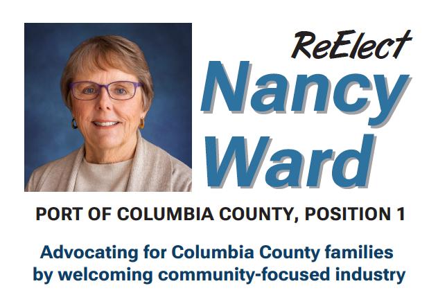 Paid for by Nancy Ward 4 Port of Columbia County Trusted • Informed Dedicated to Columbia County Re-Elect Chip Bubl Port Commissioner Charting the best course for the Port Vote by May 16 Paid for by the Committee to Elect Charles Bubl