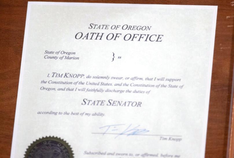 The Oath of Office on the desk of State Senator Tim Knopp in Senate chambers at the Oregon State Capitol in Salem. See AWOL Page A2