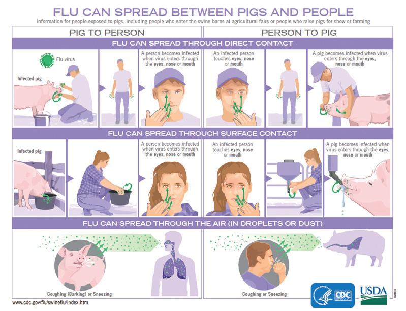 recommendationsProtection People who are at higher risk for influenza complica tions should avoid exposure to pigs and swine barns at fairs this year. If you cannot avoid exposure to pigs, you should wear a well-fitting mask that covers the nose and mouth and you should perform hand hygiene fre quently.Allpersons should take precautions when engaging in activities that may involve swine contact. Precau tions include hand hygiene before and after exposure to animals, avoiding eating or drinking in animal areas, and avoiding close contact with animals that look or act ill. Patients who experience influenza-like symptoms fol lowing direct or close contact with pigs and who seek medical care should inform their health care provider about the exposure. Those at high risk for complications should seek healthcare as soon as possible after symp tomOregononset. public health departments have enhanced surveillance for respiratory symptoms illness during the agricultural fair season. Early identification and investi gation of variant influenza virus infections are important to determine whether the virus is spreading efficiently amongClinicianspeople.are encouraged to consider variant influenza virus infection as a possible diagnosis when evaluating patients with acute respira tory illnesses and exposure to pigs or agricultural fairs prior to illness.