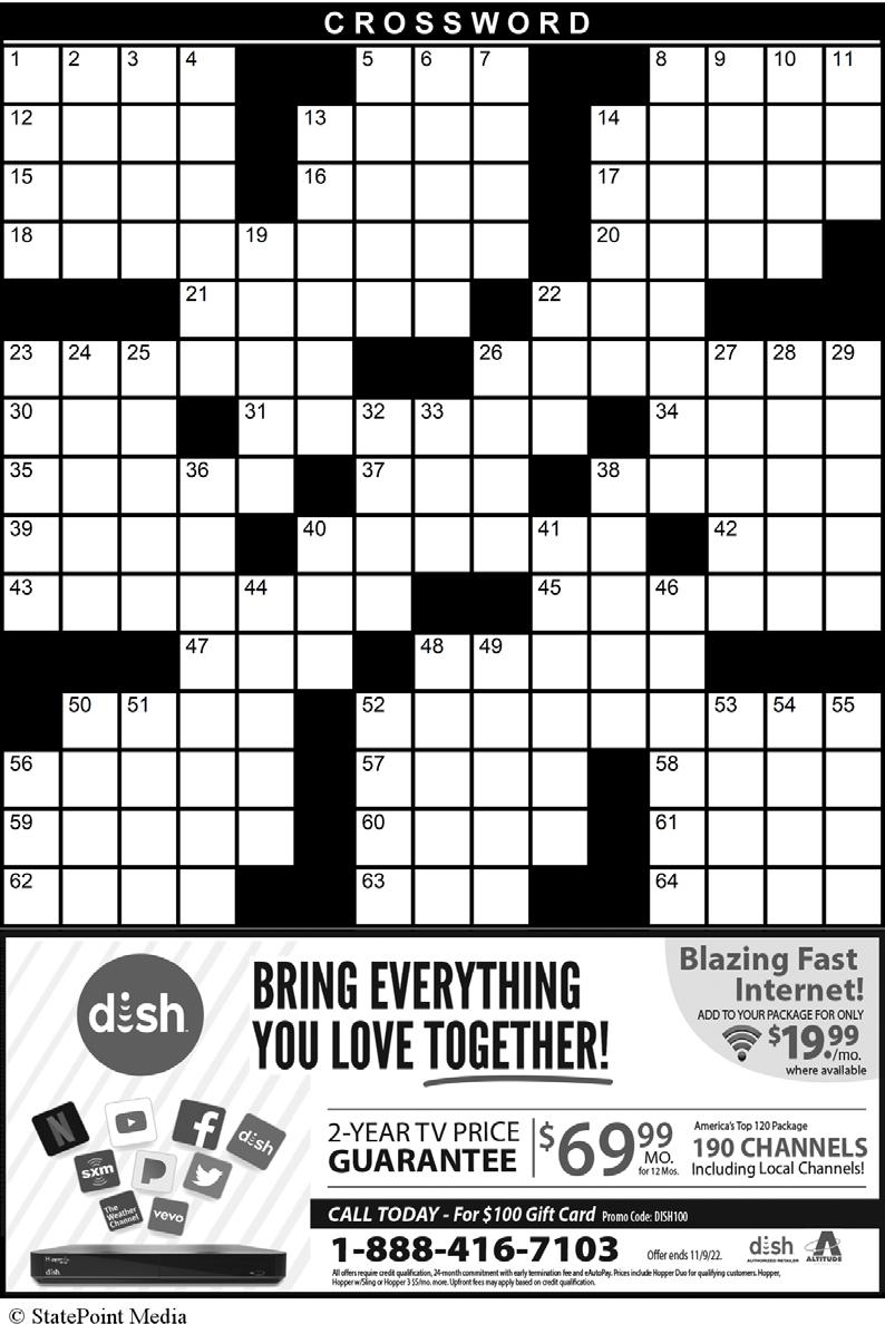 NOTICE OF PUBLIC HEARING The Public Notice deadline is Wednesdays by noon. Late submissions are not guaranteed to make it into the paper. ACROSS 1. *”____ Wars” toys from Kenner in the ‘70s 5. *Certain toy G.I. 8. Miss America’s acces sory 12. Pot inhale 13. Morsel of Little Miss Muffet’s meal 14. Private 15. Larger-than-life 16. Children’s author ____ Blyton 17. Post-Its 18. *Sticks and spools toy set 20. One of the Olsens 21. Gibson garnish 22. Middle-earth creature 23. Bias 26. Neat in appearance 30. Chasing game 31. Chancellor, in Europe 34. Not happening 35. Anomie, alt. sp. 37. Local area network 38. Re-attempt 39. Wyatt Earp’s card game 40. Common parakeet, colloquially speaking 42. Snakelike fish 43. Not yet a wife 45. *Like certain toy Cathy 47. Mine deposit 48. Water nymph 50. Cassette contents 52. *Illuminated picture maker 56. Wainscots 57. Play parts 58. The Fonz: “Sit ____ ____!” 59. Face-to-face exams 60. Not this 61. Brainchild 62. Homey, alt. sp. 63. “Fight for You” singer 64. High rocky hills DOWN 1. Editor’s mark 2. African antelope 3. Related 4. Suppose 5. Political club, in the olden days 6. Celestial hunter 7. Whirlpool 8. *Sno-Cone, actually (2 words) 9. Opposed to 10. “As ____ on TV” 11. Retail posting acronym 13. Blood-red 14. Beginning of essay 19. “Dear Diary” bit 22. Hockey legend 23. “The Office” people, e.g. 24. Veranda on Oahu 25. Ancient Greece mar ketplace 26. “The ____ Show” (1976-1980) 27. Sacred song 28. White heron 29. *Raggedy Ann or Strawberry Shortcake, tenderly 32. *Professor Plum and Colonel Mustard game 33. Little bit 36. *Avenues and rail roads game 38. Betty Ford Center, e.g. 40. Spelling contest 41. Superlative of icy 44. Edible herb 46. Quick and skillful 48. Specialty 49. Rose oil 50. Tropical edible root 51. Dwayne Johnson’s 2022 role Black ____ 52. Wooden slat 53. ____-China 54. Part of a traditional wedding cake 55. Greek Hs 56. *Play-____ STATEPOINT CROSSWORD THEME: CLASSIC TOYS Solution to crossword in next week’s issue of The Chief. • •C rossword p uzzle • • 1805 Columbia Blvd, St. Helens, OR thechiefnews.com 503-397-0116 The Chief Read local news online at thechiefnews.com Keep up to date with local news, community events, advertisements, and more. check the classifieds online at www.thechiefnews.com to find your perfect job offer Need a job?