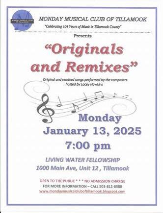 HH25-101 Tillamook County Transportation District PUBLIC MEETING NOTICE. Meetings are held at the Transportation Building located at 3600 Third Street, Tillamook unless otherwise indicated. Persons requiring physical or visual accommodation or who would like a copy of the meeting agenda may contact the District office at (503) 815-8283 before noon, meeting day. Agendas are also available on the District website at https:// www.nwconnector.org/tillamooktransportation-board-meetings/ Participants are welcome to join this meeting virtually. To attend by phone, please dial: +1 (253) 2158782 Meeting ID: 873 0967 4127. To attend virtually, please use this link: https://us02web.zoom. us/j/87309674127. Wednesday, January 8, 2025 @ 5:30pm Transportation Advisory Committee Stakeholder Meeting. The Tillamook County Transportation District (TCTD) is seeking input and recommendations from the Transportation Advisory Committee (TAC), and the public, for projects related to the FY25-27 biennium Statewide Transportation Improvement Fund (STIF). 1/7/25