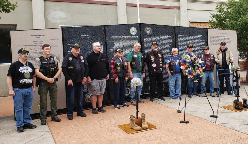 A group of veterans stand in front of the Oregon Veterans Memorial Traveling Wall at the Second Street Plaza in Tillamook on May 26. The wall contains the names of Oregon service members who lost their lives during the Vietnam War and subsequent conflicts. The wall was transported to Tillamook and assembled by the Vietnam Veterans of America Umpqua Valley Chapter 805 and arrived with a police escort.