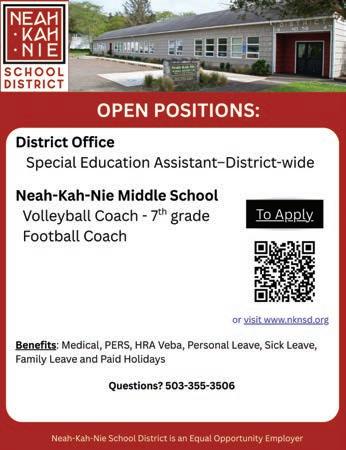 To view job details, qualifications and more job postings, visit our website www.tillamook.k12.or.us Questions? Contact: Hannah Snow Roberts, snowh@tillamook.k12.or.us, (503) 842-4414, ext. 1200