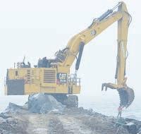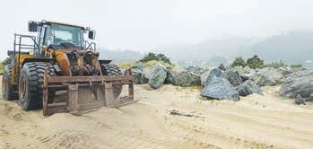 Crews from Trade West began placing stones near the head of the south jetty at the entrance to Tillamook Bay in the second week of August, after working to stockpile stones since last fall. Originally scheduled as a threeyear project but eventually contracted for completion in two, workers are now pushing to complete the 800-foot section before high tides shut down operations at some point in October, though they are unsure if that will be possible.