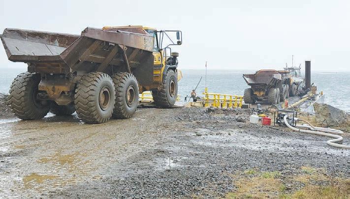 A site superintendent with Trade West said the large volume would test the quarry’s capacity and that the team wasn’t sure rock would arrive fast enough to complete the project before weather shuts it down for the year. Currently, a large stockpile of rocks sits at the base of the jetty while large haul trucks continuously transport newly delivered stones from the Port of Garibaldi, via barge and haul road directly to the team placing them at the end of the jetty. Those