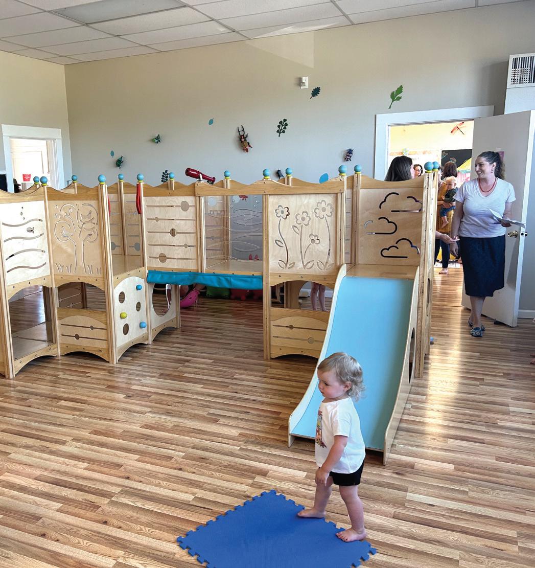 The space is equipped with educational toys, an indoor play structure, a play kitchen, baby dolls, dressup clothes, trains, an art room, and a “Share Closet” where other families can reuse clothing and gear donated by members.