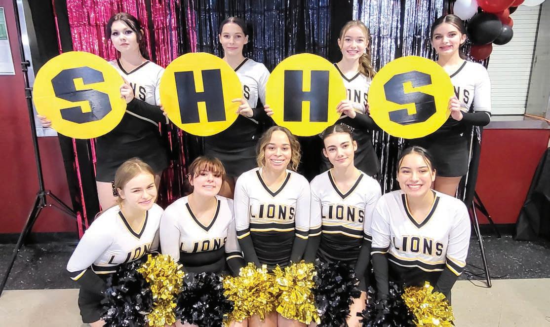 The cheerleaders pictured are, top row, Katie Duke, Halli Heys, Keely Scoville, and Montana Sloan. Bottom row, Alexandra Johnson, Tarrah Lemont, Maggie Burke, Haylie Matheny, and Aliciyah Miguel-Cloninger.