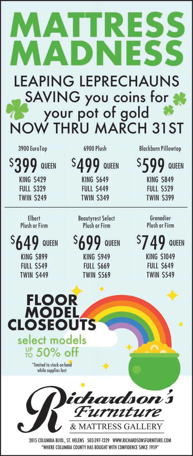 All that we ask for is an insurable driving record, a minimum age of 25, consistency and attention. Please send your information to anoasphalt@ gmail.com and we will follow up. Transit Driver PT, Temp, On-Call. Columbia County, OR. EOE. Open until filled. Apply at ColumbiaCounty OR.gov. 702 Garage Sales Moving Sale: Sat. & Sun., March 11 & 12 from 10 am - 4 pm at 32762 Bellcrest off of Vernonia Hwy (last house). Kayak, inflatable paddle board, grill, smoker, snow shoes, tools, gardening, furniture, kids stuff and more. Cash or venmo. No earlies. Family on site. 502 Help Wanted 502 Help Wanted Waterman Garage DoorsCCB#204858 SALES, SERVICE INSTALLATION 503.819.6715 St. Helens, OR 97051 Scott Waterman Owner Advertise your business in the Business & Service Directory. Call 503-397-0116 for more information YOUR AD HERE Columbia County BUSINESS & SERVICE DIRECTORY www.thechronicleonline.com Get your ad in the paper and reach out to potential customers. Call 503-397-0116 to place your ad in the newspaper and online. New to St. Helens! Commercial or house soft wash services, all surface cleaning from ground to fences, complete moss removal from roof, gutter cleanings, and fleet washing. 503 680-7657 pwcurbappeal.com OVER 30 5/5 reviews on Google! Chronicle and News/Ad Classified Ad Deadline is Monday by noon Ads received after the deadline are not guaranteed to be placed in that week’s issue. Send subscription info to PO Box 1153, St. Helens OR 97051 Card No. __________________________________________ Exp. Date _________________ Name ______________________________________________________________________ Address ____________________________________________________________________ City __________________________________ State ________________ Zip _____________ Phone Number ______________________________________________________________ Enclosed is my check for $70.00 Bill my VISA/Mastercard Subscribe me to the: The Chronicle The Chief $70 a year in Columbia County, $90 a year for outside county SUBSCRIBE TO YOUR FAVORITE LOCAL COUNTY NEWSPAPER AND GET FREE ACCESS TO ONLINE NEWS Let us know what YOU think EMAIL YOUR LETTERS TO: CHRONICLENEWS@COUNTRYMEDIA.NET Get the word out in the paper and online by advertising with The Chronicle and The Chief Call us at 503-397-0116 or email chronicleads@countrymedia.net Starting a local business?