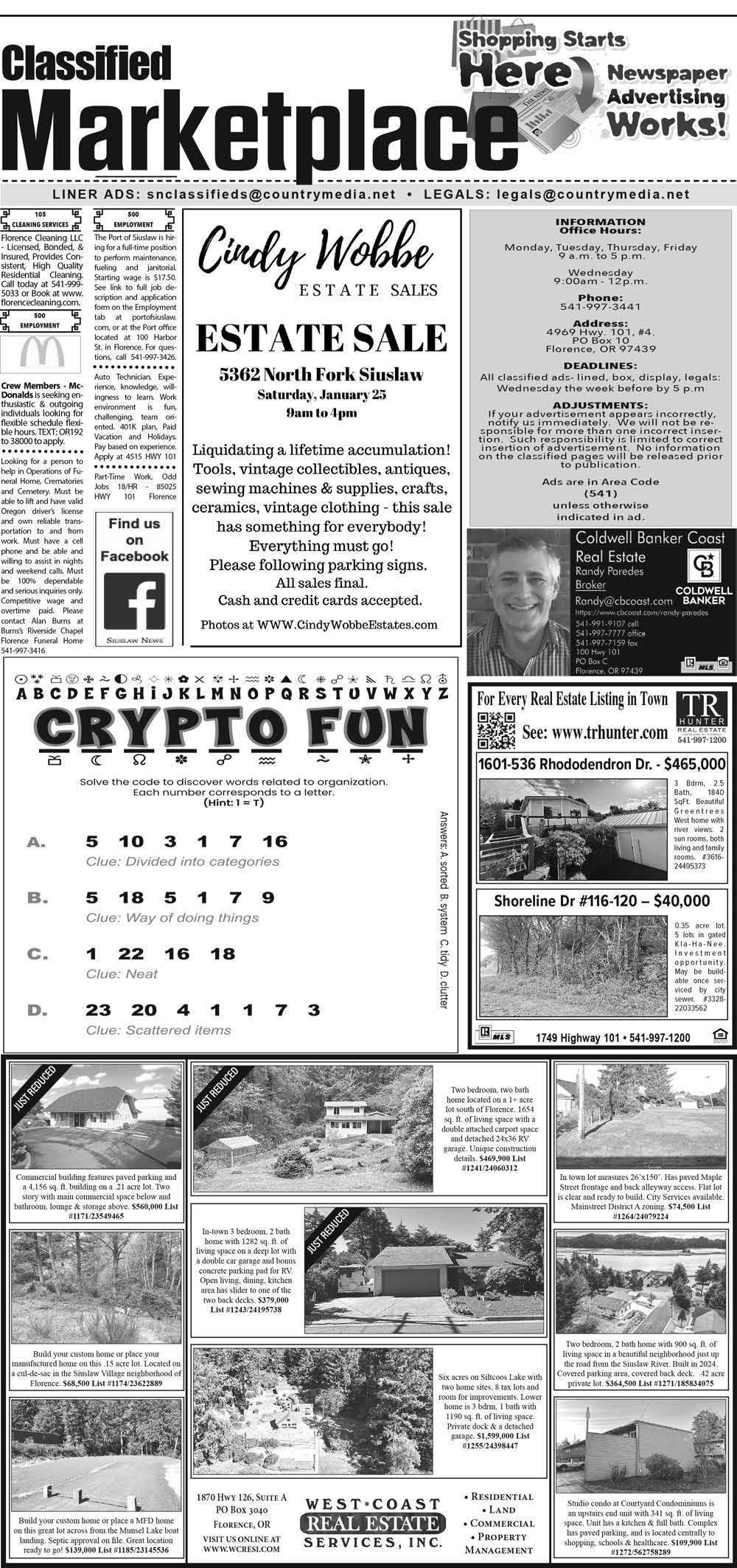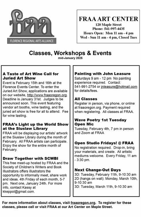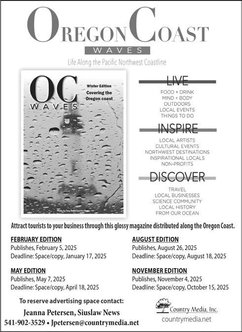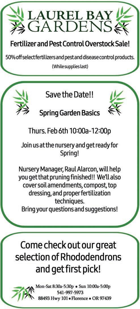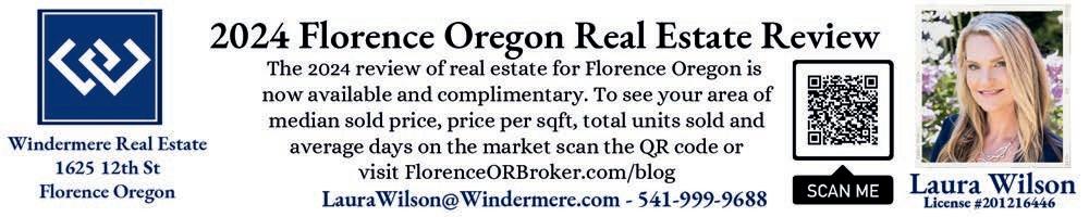 The Chamber’s visitor center and gallery is at 290 Highway 101 in Florence. Winter hours are Monday through Friday 10:00 a.m. to 4:00 p.m. The phone number is 541-997-3128. For more information about volunteering with the Florence Area Chamber of Commerce, visit FlorenceChamber. com or contact visitor center manager Lisa Brandow at vcmanager@ FlorenceChamber.com. For Chamber membership, programs, and advocacy, contact president/CEO Bettina Hannigan at bettina@florencechamber.com.