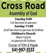CROSS ROAD ASSEMBLY OF GOD Corner of 10th & Maple- 541-997-3533 Sunday Services 9am 1st Service in person Sunday Services 11am 2nd Service in person & livestreamed Wednesday kids/youth night is at 6:30