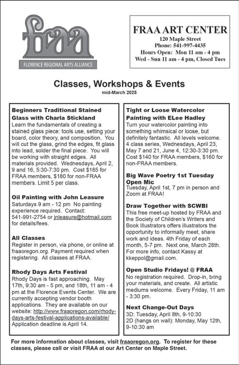 Editor’s note: Due to space constraints, the story about the investigation into allegations made against Children’s Repertory of Oregon Workshops (CROW) will appear on our website this week and in the print edition next week, along with information about what’s happening across from Fred Meyer, and an OSU study about where Florence gets its news and information. Go to thesiuslawnews.com to check it out.
