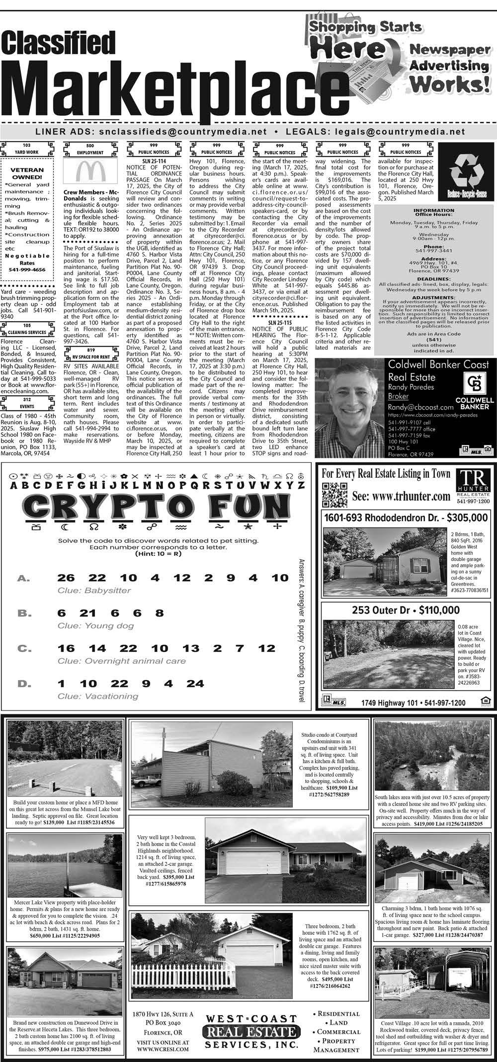 2nd & Kingwood • (541) 997-6025 Sunday worship is at 10:30 a.m. Sunday School for adults is at 9:00 a.m. Online services at www.florenceunitedmethodist.org or find us on Facebook.