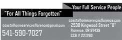 the right of the main entrance. ** NOTE: Written comments must be received at least 2 hours prior to the start of the meeting (April 15, 2024, at 3:30 p.m.) to be distributed to the City Council and made part of the record. The agenda for the meeting will be published on the City’s website the Thursday prior to the meeting at https://www.ci.florence.or.us/council/ city-council-meeting-261. To be notified when the agenda and meeting materials are available, please subscribe to the City Council meeting distribution list at www.ci.florence. or.us/newsletter/subscriptions. 4/10 $1,850/mo.- 3bdrm., 1.5ba.Central location, recently remodled, w/d hook-ups, includes water/sewer. For info call Advanced Property Management: 541269-7210. RENTALS CARPET CLEANING Upholstery STEAM OR DRY Smoke • Water Cleanup 997-3825 Certified-Bonded CCB #96660 Major credit cards accepted Tweety Sez: Consistent, Quality Cleaning. For clean as a whistle, call 997-2385. Florence Janitorial Services Bill and Jo Hine, Owners CERTIFIED, LICENSED, BONDED & INSURED tfc CCB #96660 Ant’s Concrete Excavation, flat work, sidewalks, patios, demos and much more! Blinds • Shades • Draperies • Shutters We Design ~ We Install Residential • Commercial • 30 Years Experience CCB#212734 541-991-3405 Located in Florence BLINDS / WINDOW TREATMENTS Ray Wells, Inc EXCAVATING • SEPTIC SYSTEMS • SUBDIVISIONS LAND CLEARING • PAVING • TRUCKING BRUSH & DEBRIS RECYCLING • DEMOLITION Ph. 541-997-2054 • Fax 541-997-3499 • 1-877-201-0652 cB# 91052 DeQ#37263 P.O. BOx 3467 1770 LaureL PL FLOrence, Or 97439 EXCAVATING 1845 Hwy 126 Unit A-10, Florence, OR 97439 www.garnerlawoffice.net Business Law Real Estate Law Free Consultations 541.991.8121 LEGAL SERVICES Yes! WE DO WINDOWS! Commercial • Residential Connie, Bill & Mike Spinner–997-8721 Window Cleaning WINDOWS SIUSLAW VALLEY ELECTRIC, INC. RESIDENTIAL • COMMERCIAL CONTRACTING 1710 Laurel Way - Airport Industrial Park Store Hours: Mon. thru Fri., 8 A.M. to Noon Forrest G. Grigsby • Stanton E. Grigsby P.O. Box 1216 • sve-1973-grigsby@hotmail.com Ore. BBR No. 8689 Phone 997-8821 FAX 997-3723 ELECTRICAL CLEANING SERVICES CONCRETE / PAVING PROPANE SERVICES We Pride ourselves on providing the best customer service possible. 541-746-4621 • www.rdpropane.com R&DPropane Residential and Commercial delivery service Family Owned and Operated Since 1983 NowFlorence!Serving DIRECTORY Business & Service CARPET CLEANING Upholstery STEAM OR DRY Smoke • Water Cleanup 997-3825 Certified-Bonded CCB #96660 Major credit cards accepted Tweety Sez: Consistent, Quality Cleaning. For clean as a whistle, call 997-2385. Florence Janitorial Services Bill and Jo Hine, Owners CERTIFIED, LICENSED, BONDED & INSURED tfc CCB #96660 Ant’s Concrete Excavation, flat work, sidewalks, patios, demos and much more! Blinds • Shades • Draperies • Shutters We Design ~ We Install Residential • Commercial • 30 Years Experience CCB#212734 541-991-3405 Located in Florence BLINDS / WINDOW TREATMENTS Ray Wells, Inc EXCAVATING • SEPTIC SYSTEMS • SUBDIVISIONS LAND CLEARING • PAVING • TRUCKING BRUSH & DEBRIS RECYCLING • DEMOLITION Ph. 541-997-2054 Fax 541-997-3499 1-877-201-0652 cB# 91052 DeQ#37263 P.O. BOx 3467 • 1770 LaureL PL • FLOrence, Or 97439 EXCAVATING 1845 Hwy 126 Unit A-10, Florence, OR 97439 www.garnerlawoffice.net Business Law Real Estate Law Free Consultations 541.991.8121 LEGAL SERVICES Yes! WE DO WINDOWS! Commercial • Residential Connie, Bill & Mike Spinner–997-8721 Window Cleaning WINDOWS SIUSLAW VALLEY ELECTRIC, INC. RESIDENTIAL • COMMERCIAL CONTRACTING 1710 Laurel Way - Airport Industrial Park Store Hours: Mon. thru Fri., 8 A.M. to Noon Forrest G. Grigsby • Stanton E. Grigsby P.O. Box 1216 • sve-1973-grigsby@hotmail.com Ore. BBR No. 8689 Phone 997-8821 FAX 997-3723 ELECTRICAL CLEANING SERVICES CONCRETE / PAVING Call your advertising PROPANE SERVICES We Pride ourselves on providing the best customer service possible. 541-746-4621 • www.rdpropane.com R&DPropane Residential and Commercial delivery service Family Owned and Operated Since 1983 NowFlorence!Serving DIRECTORY Business & Service Call to Advertise Here! 541-902-3526