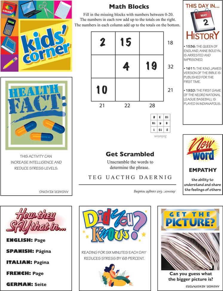 SIUSLAW NEWS • WEDNESDAY, MAY 1, 2024 B7 Make the smart and ONLY CHOICE when tackling your roof! Before After + New orders only. Does not include material costs. Cannot be combined with any other offer. Minimum purchase required. Other restrictions may apply. This is an advertisement placed on behalf of Erie Construction Mid-West, Inc (“Erie”). Offer term and conditions may apply and the offer may not available in your area. If you call the number provided, you consent to being contacted by telephone, SMS text message, email, pre-recorded messages by Erie or its affiliates and service providers using automated technologies notwithstanding if you are on a DO NOT CALL list or register. Please review our Privacy Policy and Terms of Use on homeservicescompliance. com. All rights reserved. License numbers available at eriehome.com/erie-licenses/ LIMITED TIME OFFER! SAVE! UP TO 50% INSTALLATION AN ADDITIONAL 10% for military, health workers and first responders OFF OFF + 1.855.483.1089 FREE ESTIMATE Expires 4/30/2024 Receive a free 5-year warranty with qualifying purchase*valued at $535. Call 877-557-1912 to schedule your free quote! & Donate Your Car Imagine the Di erence You Can Make Vehicle donations are fully tax-deductible and the proceeds help provide services to help the blind and visually impaired. Help Prevent Blindness Get A Vision Screening Annually FREE TOWING & TAX DEDUCTIBLE a $200 restaurant voucher ✔ a 2-night, 3-day hotel stay at one of 50 locations Call 1-844-533-9173 When you donate your car, you’ll receive: 1. GEOGRAPHY: Which of the Great Lakes is smallest in surface area? 2. TELEVISION: Which sitcom has the theme song, "Where Everybody Knows Your Name"? 3. ANATOMY: Which part of the human body is involved with ACL surgery? 4. GAMES: What is the victim's name in the U.S. version of the board game "Clue"? 5. ANIMAL KINGDOM: What is the world's largest species of frog? 6. SCIENCE: What do isobars indicate? 7. LITERATURE: In the novel "Don Quixote," who is the human companion to the title character? 8. MOVIES: In which movie did actor Bill Murray live the same day over and over? 9. THEATER: Who is believed to be the first actor in a Greek drama? 10. MUSIC: What is the name of Beyonce's 2024 country album? © 2024 King Features Synd., Inc. Answers 1. Lake Ontario. 2. “Cheers.” 3. The knee. 4. Mr. Boddy. 5. Goliath frog. 6. Atmospheric pressure. 7. Sancho Panza. 8. “Groundhog Day.” 9. Thespis, 6th-century poet 10. “Cowboy Carter.” Posting Date April 29, 2024 OLIVE