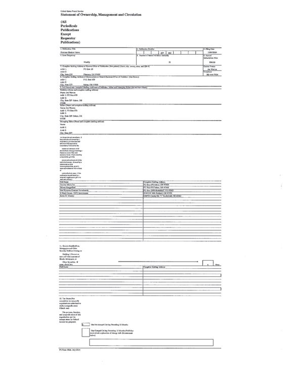 Country Media offers several options for submitting obituaries, each catering to different needs and preferences: DEATH NOTICE: This option includes basic information such as the deceased’s name, age, town of residency, and details about any funeral services. There is no charge for this service. If you wish to add a photo, there is a $35 fee. STANDARD OBITUARY: For $100, you can submit an obituary with up to 200 words. Each additional 200 words cost $75. A small photo can be included at no extra charge. If you’d like to add more photos, each additional one costs $35. 50% OFF PICKUP OPTION: If you choose to republish an obituary within one month of its original publication date without making any changes, you’ll receive a 50% discount. ONLINE: All obituaries are placed online at no additional charge. Contact your local newspaper office for submission deadline and how to submit payment information. Obituaries must be prepaid before publication. Information can be brought or mailed to Siuslaw News, 4969 HWY. 101 North, #4 PO Box 10, Florence OR, 97439, Or emailed to snofficemanager@ countrymedia.net For more information call: 541-997-3441