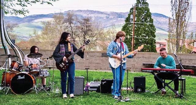 Tom plays acoustic guitar; Debbie plays bass guitar and Blum plays lead guitar. Their