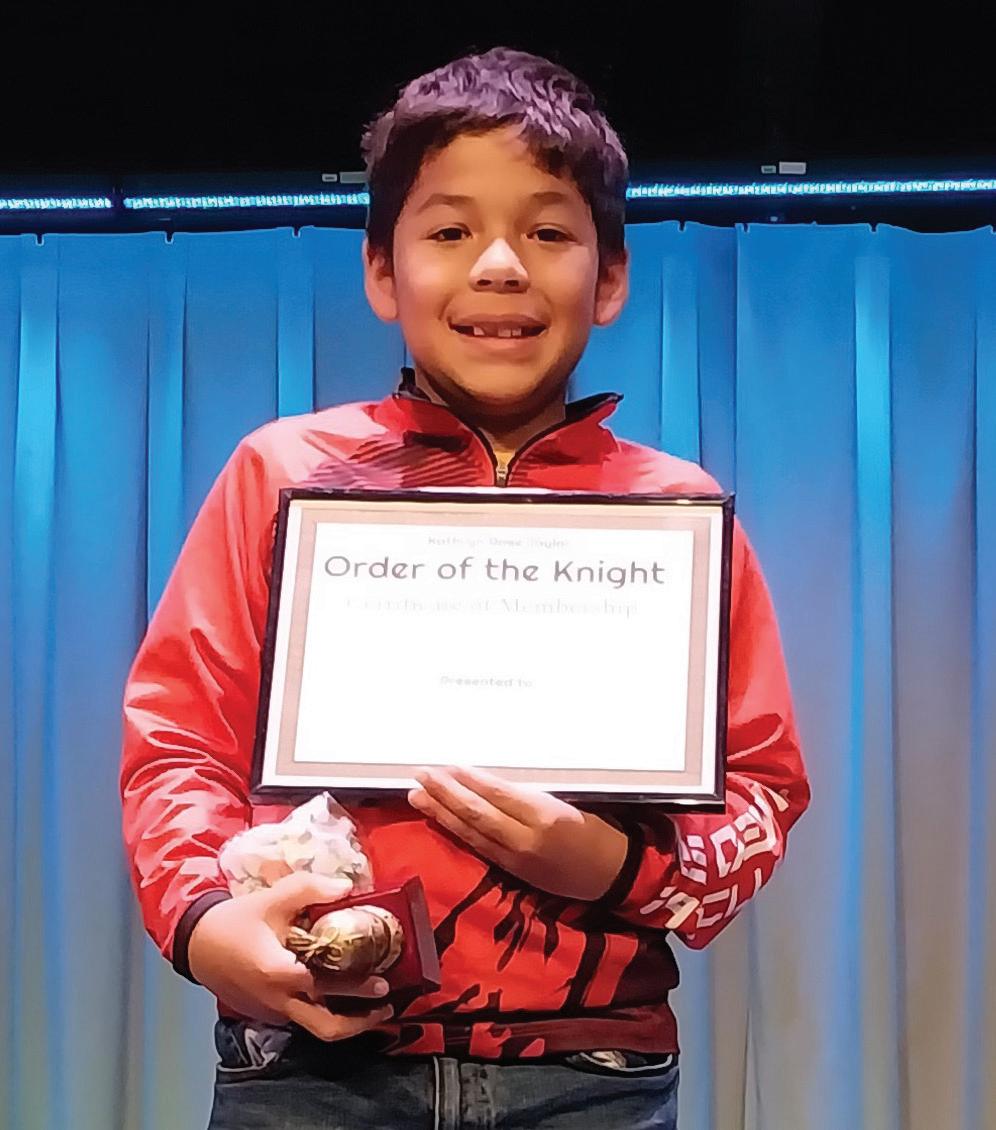 Malichai Florez (Coquille) with his Order of the Knight award, trophy and candy.