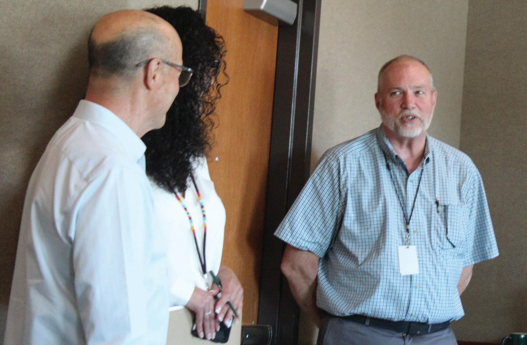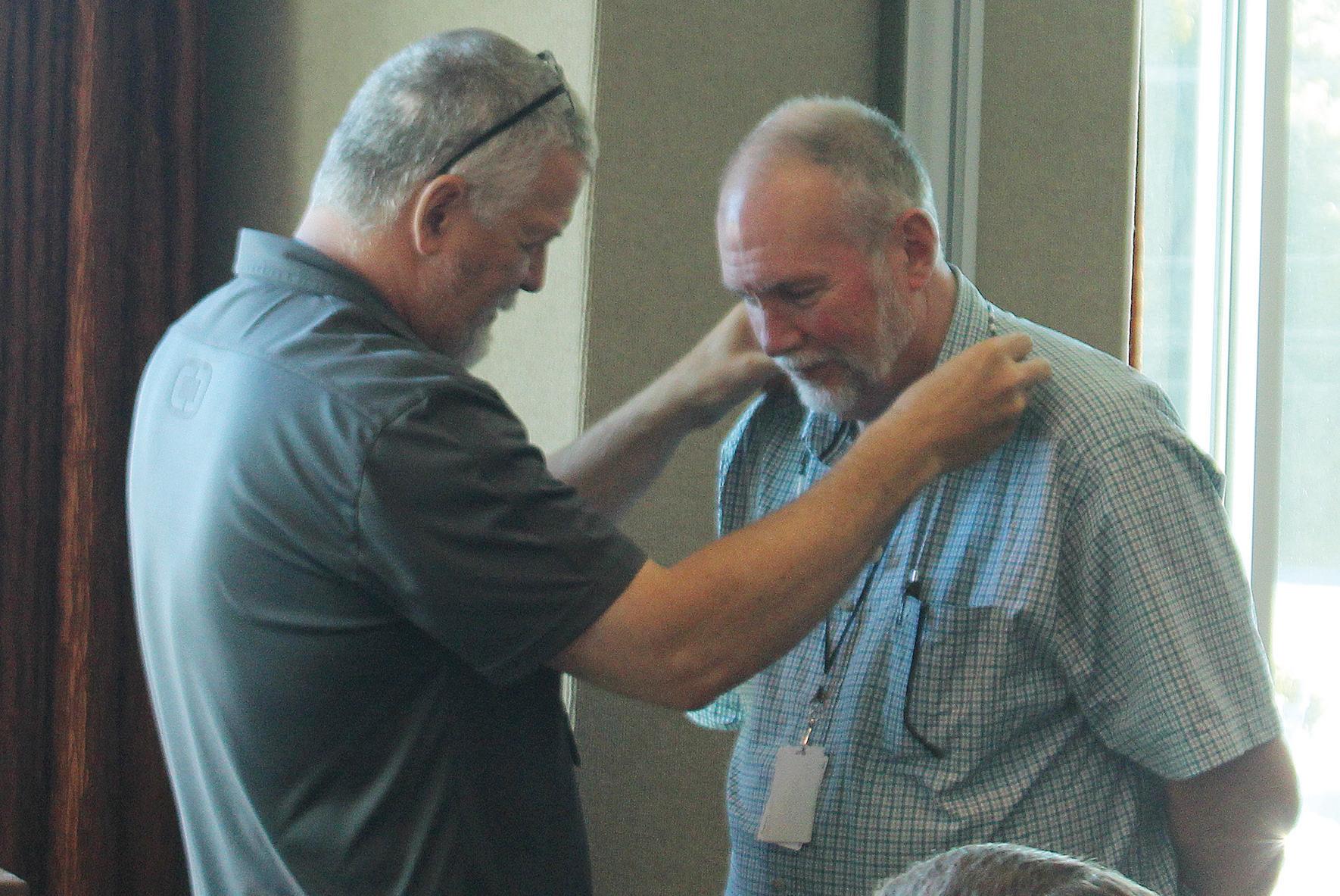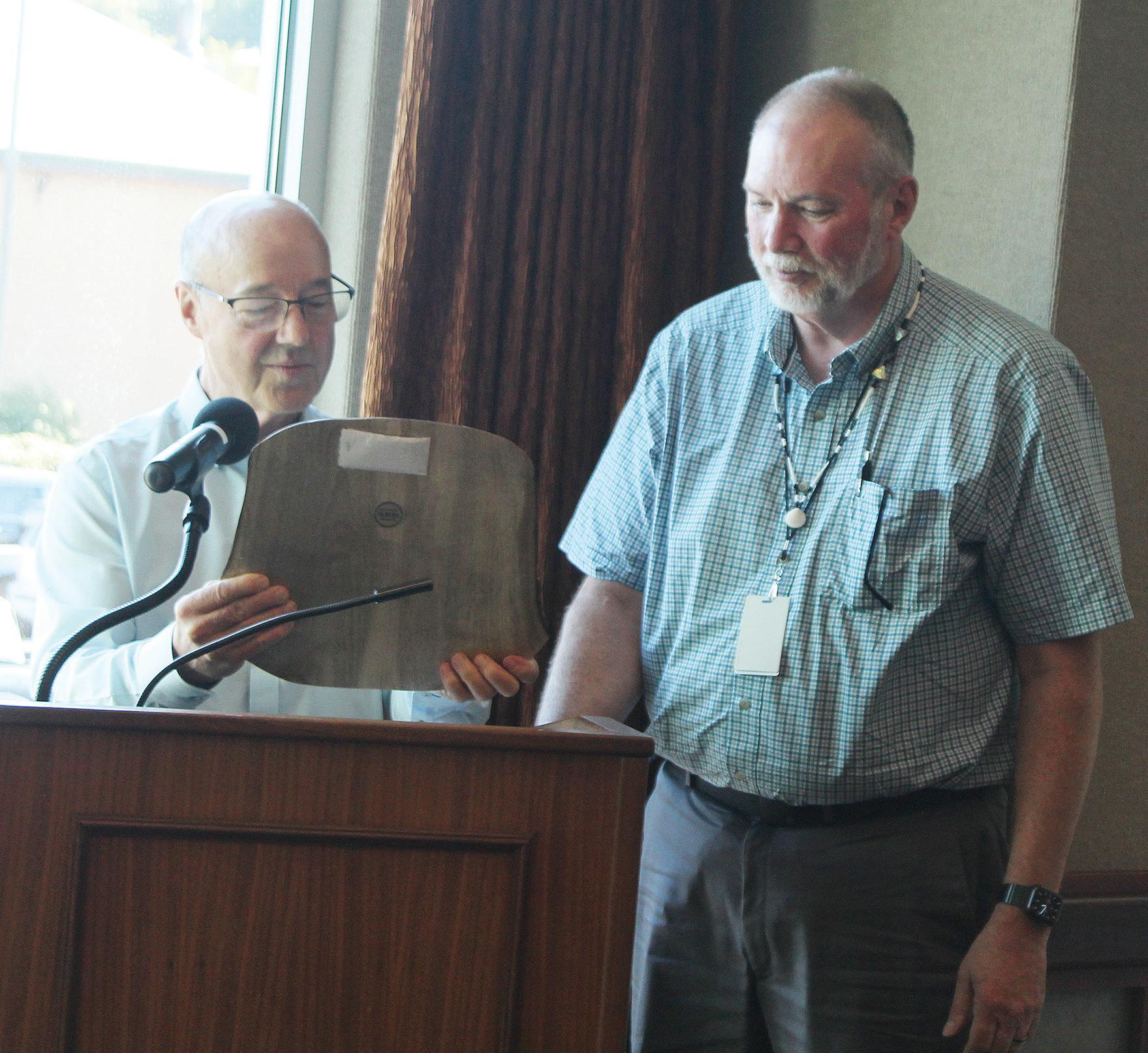 Rodger Craddock accepts a gift from Mark Johnston, the executive director of the Coquille Indian Tribe, during Craddock’s retirement party.