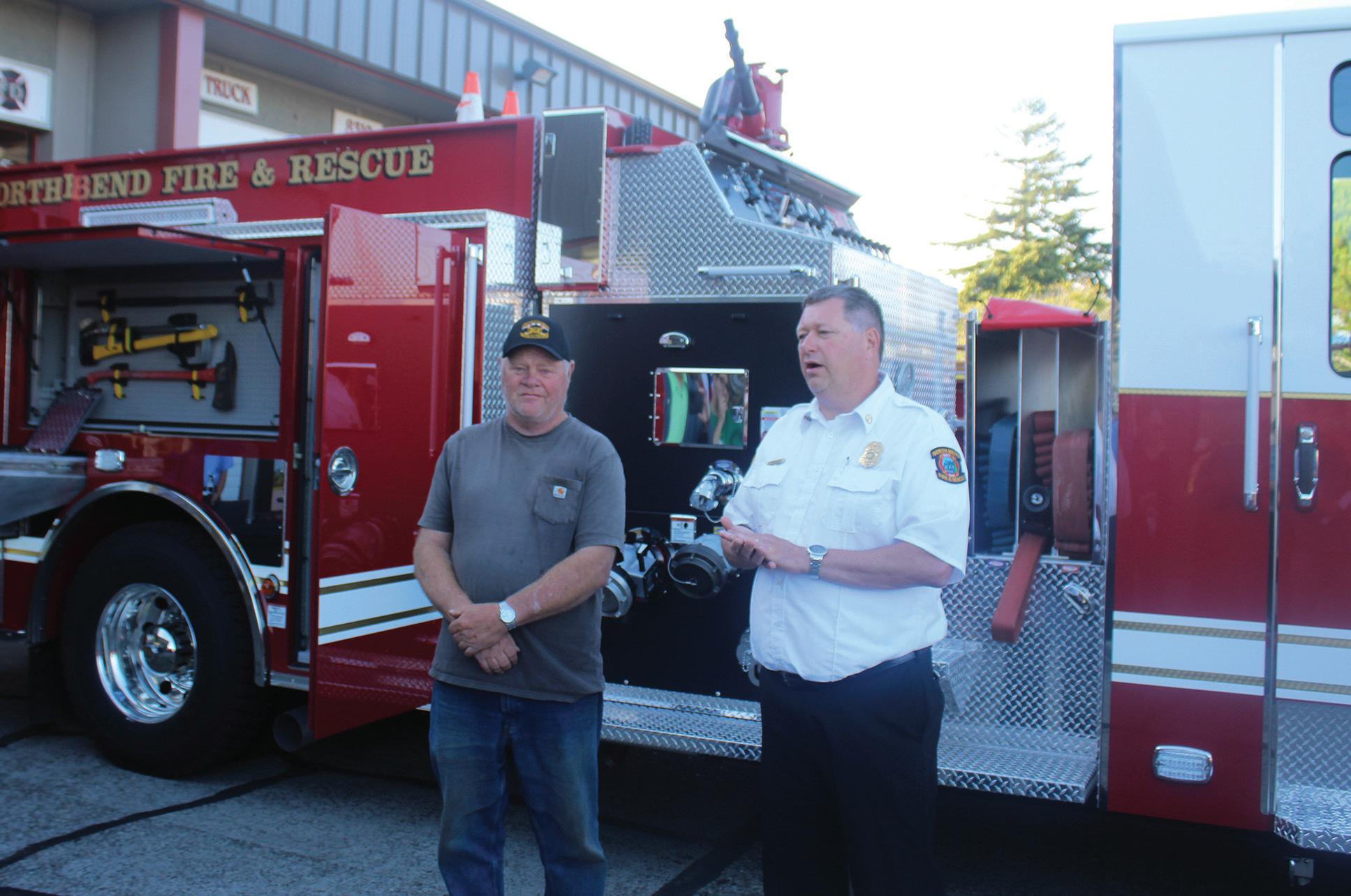 North Bend Fire Chief Jim Brown, right, and Councilman Pat Goll discuss the new fire engine North Rend started using last week.