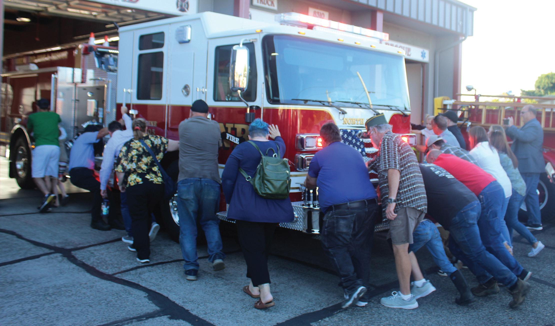 At the end of the ceremony, the community gathered with the firefighters and pushed the engine into