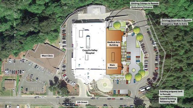 The site plan of the proposed medical arts building attached to the east side of the hospital. Illustration courtesy Coquille Valley Hospital