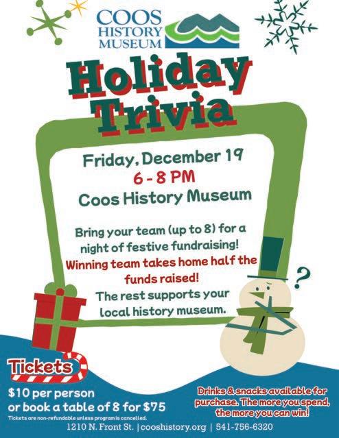 The trivia is $10 per person or $75 for a table of 8 and admission funds go into the pot for the 50/50 raffle that the winning team will take home. To purchase a ticket, contact 541-756-6320, stop by the front desk at 1210 N. Front St., or visit cooshistory.org.