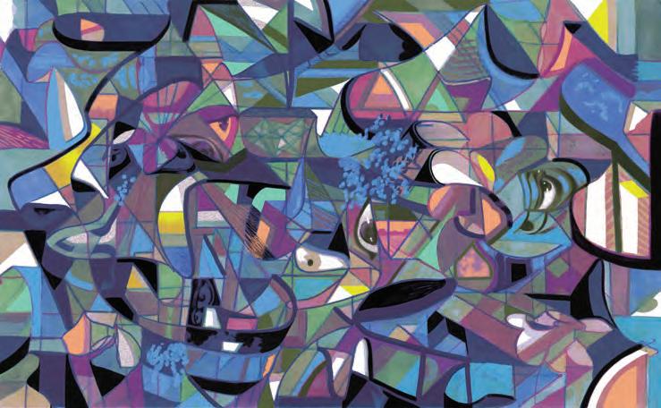 The pigments are hand-mixed, and radiate with precision and emotion. Brilliant color interacts with intricate brushwork, drawing the viewer close from across the room. His current series, defined by pastel and jewel-toned fragments—stacked, scattered, and interlocked—speaks to his fascination with structure. Their softened edges and luminous harmonies suggest a deep appreciation and understanding of the