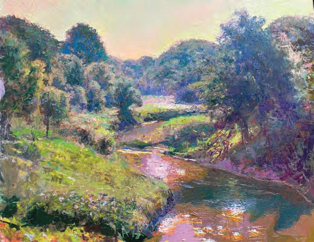 When I first met DeLoach, we went out to a bridge so I could see him paint. He scratched in the general shapes in charcoal, and then began painting with his palette knife—a method favored by Britt and Hensche as a way to discourage linear drawing and invite the study of color, compelling the artist to lay down a color note instead of racing toward a finished image. Palette knives are also easier to clean than brushes; one swipe of a paint rag and you can start again without muddying the colors. DeLoach doesn’t paint the typical Delta—the long horizontal lined fields, cotton patches, cypress trees. Instead, he is concerned with interpreting the colors in the time of day or light key. “The Delta is my home. I like it because it’s wide-open, expansive, and for the big skies. It has a universal quality to it, and my work isn’t meant to define the Delta, but rather to define sunlight.”