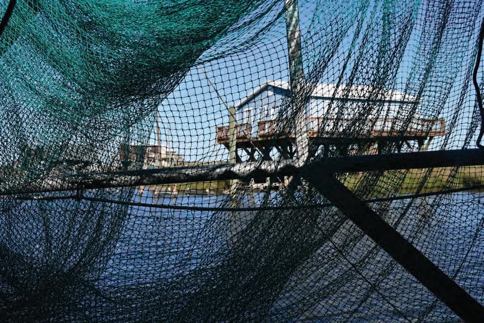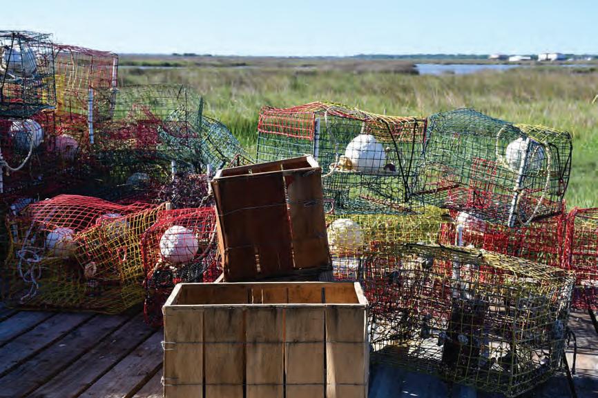 for his day job as a commercial crabber. Before Hurricane Ida, Perrin had seven hundred crab traps but now only maintains about three hundred. He checks them all twice a week and harvests around two thousand pounds per week. He sells exclusively to Lapalco Seafood in Gretna, except for the soft shells, which he offers to passing boats for $60 per dozen.