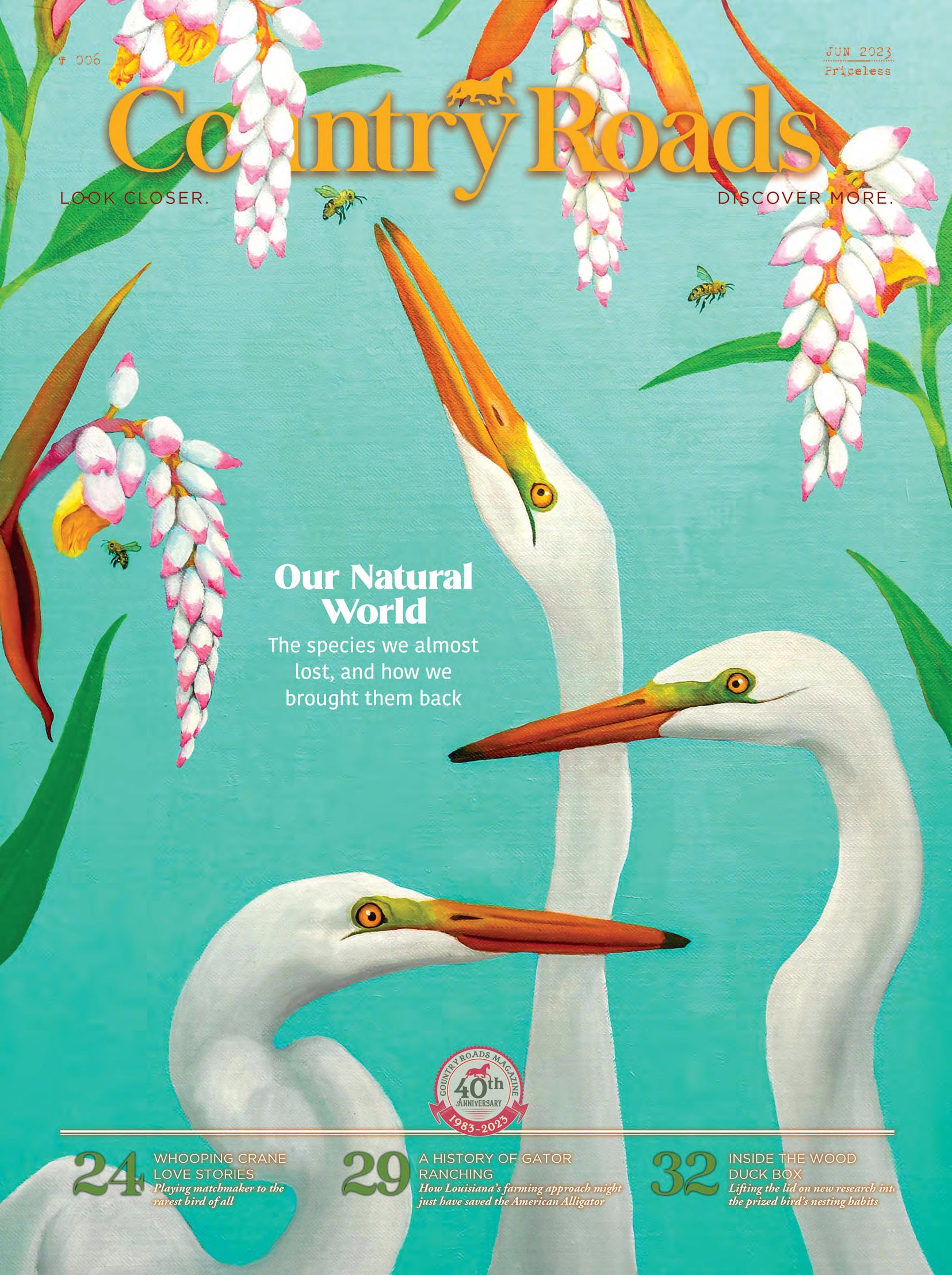 In this year’s “Our Natural World” issue, we hone in on the ongoing work of wildlife conservation in Louisiana: from the global success story of the American alligator (page 38), to the avante-garde exploits employed to usher in new generations of the oh-so-rare whooping crane (24), to 900 acres of land in Folsom where herds of the world’s most critically endangered exotic species—Pere David’s deer, giraffes, and bactrian camels—roam free (44). In these stories, we meet scientists and wildlife enthusiasts who are dedicating their lives to ensuring the animals that are so central to our region’s identity endure, often by seeking out new ways to make our world a better home for them.
