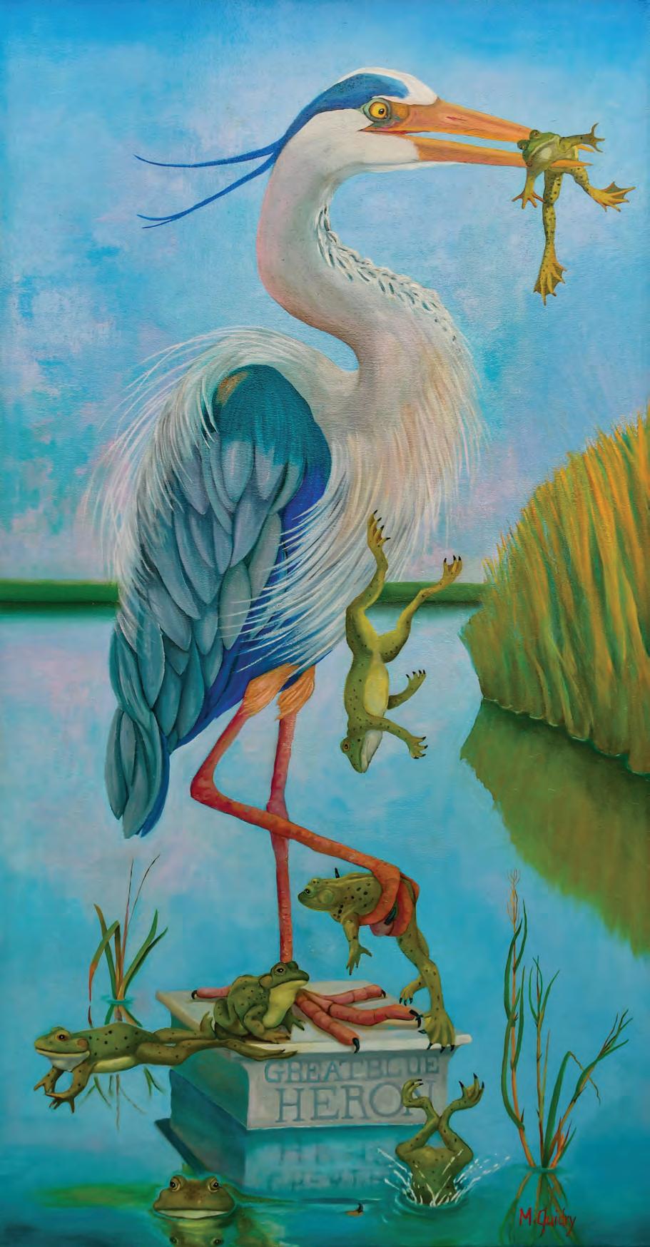 An example he uses is the origin of many of his birds-in-flight scenes. “I was just cruising down this little windy bayou, and I turned this corner, and disturbed a rookery. And like five different species of birds just started taking off and flying, and it was like in slow motion, because I was kind of going the same speed that they were.” He said that he didn’t think much of it in the moment, didn’t think ‘Oh, I should paint that,’ or anything. And months later, a painting emerged, triggering the memory. “Like . . . that has to be where this came from,” he said. The birds had lived in his subconscious, altogether, always in flight, waiting to arrive on the canvas. •