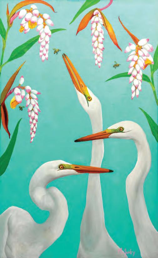 Today, the flowers arise in Guidry’s paintings whenever he wants to incorporate a sense of “home” in a particular tableau. It is fitting, then, to discover in “Three Little Birds” the blooms framing some of Louisiana’s most iconic birds, Great White Egrets—beauties that survived the Victorian era’s plumage fad (to the detriment of an estimated ninety-five percent of their population) to become one of our home’s most successful and symbolically important bird populations, a testament to the power of concentrated conservation efforts.