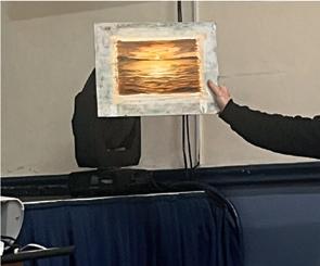 through the steps taken to produce her art pieces as well as sharing details of her favourite paints and equipment. The piece, a vivid sunset, was produced using a predominantly warm pallet of colours which continuously evolved, producing a stunning finished piece.