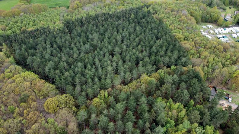 A well-managed woodland featuring a diverse mix of conifer species ranging from 1964 to 2022 as well as mixed broadleaves.