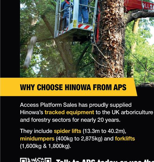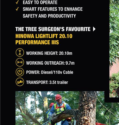 But a growing number of tree care companies are realising the very real benefits of using spider lifts with diesel thermal engines and lithium batteries. The combination can be a classic win-win, for the tree care company and their customers. A case in point, is the new Hinowa Lightlift 18.80 Performance IIIS. It is no coincidence that the diesel and lithium battery bi-energy version of the platform weighs a 3.5t trailerfriendly 2,990kg.