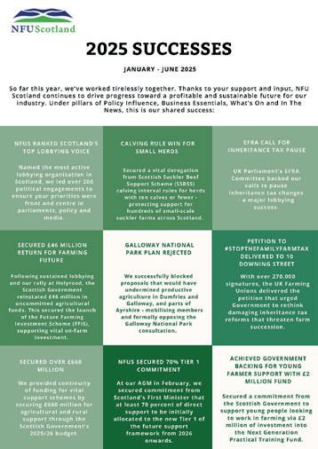 Also looking back was our first 2025 NFUS Success Report. In a continuation of our Quarterly Success Reports, it charts our progress under the new pillars of Policy Influence, Business Essentials, Your NFUS, What’s On and In The News. Highlights since 1 January include: securing the reallocation of £46 million of unrequired funds to agriculture from the Scottish Government; the rejection of the Climate Change Committee’s proposal to cut livestock numbers; identifying a £500 million opportunity for Scottish agriculture through ShelfWatch; and the Government’s decision to abandon plans for a Galloway National Park. With such a catalogue of lobbying wins, it’s worth asking: where would our industry be without NFU Scotland, its staff and its members? (Read more on pages 8–12).