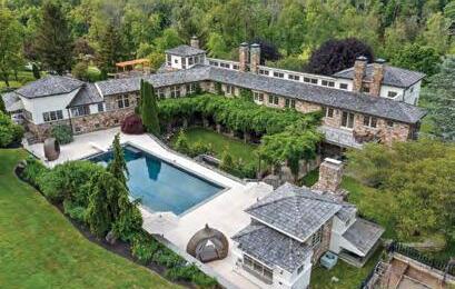 European-inspired stone manor home featuring pool with pool house, office and apartment in converted barn