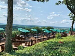 Crossing the Missouri River at McKittrick, we traced the Katy Trail to the towering limestone cliffs at Bluffton, tall enough to earn the admiration of Lewis & Clark. Behind the face of the bluffs a pathway leads to the blufftops, a mile hike straight uphill at what seems like a 45-degree angle. Take oxygen. But the view from the top is worth the huff and puff. In fact, it’s damn close to the second-best view in Missouri. A thousand feet below, a Christmas tree farm cascades toward the river, and in the distance, the river splits and channels around an island. From up here it’s hard to see that old St. John's Church and its cemetery sit on a giant mound built to keep caskets from floating during floods. I climbed downhill. Around the corner I stopped for a snack at Steamboat Junction.