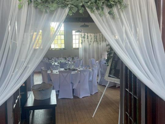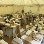 Venue décor - ceiling draping and table centres. Three course wedding breakfast, a BBQ or an elegant traditional afternoon tea.