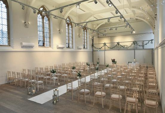 The Hythe Suite is a large, bright and airy space overlooking the courtyard and flooded with natural light. A partition wall separates the main function suite from the bar area, making it flexible and easily transformed from day to evening. There’s ample space for 180 for the ceremony and reception. Slightly smaller, The Hogarth Suite, also bright and spacious, boasts high ceilings and a separate bar. It can accommodate 120 from “I dos” to dancing.