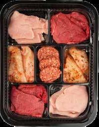 6 escalopes de porc, 3 mini burgers de boeuf, 6 escalopes de boeuf irlandais et 4 escalopes de poulet mariné. 675 g.
