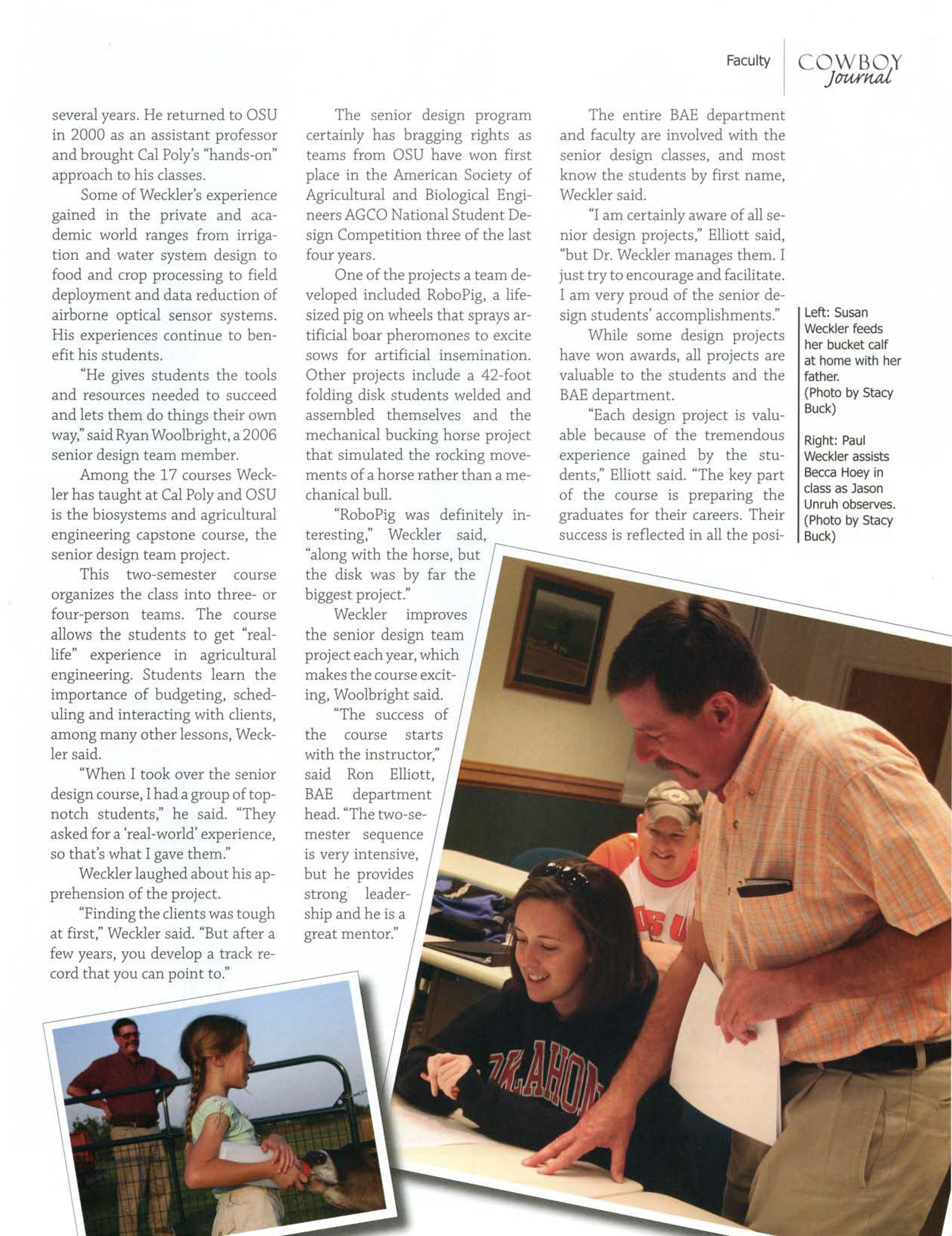 Some of Weckler's experience gained in the private and academic world ranges from irrigation and water system design to food and crop processing to field deployment and data reduction of airborne optical sensor systems. His experiences continue to benefit his students.