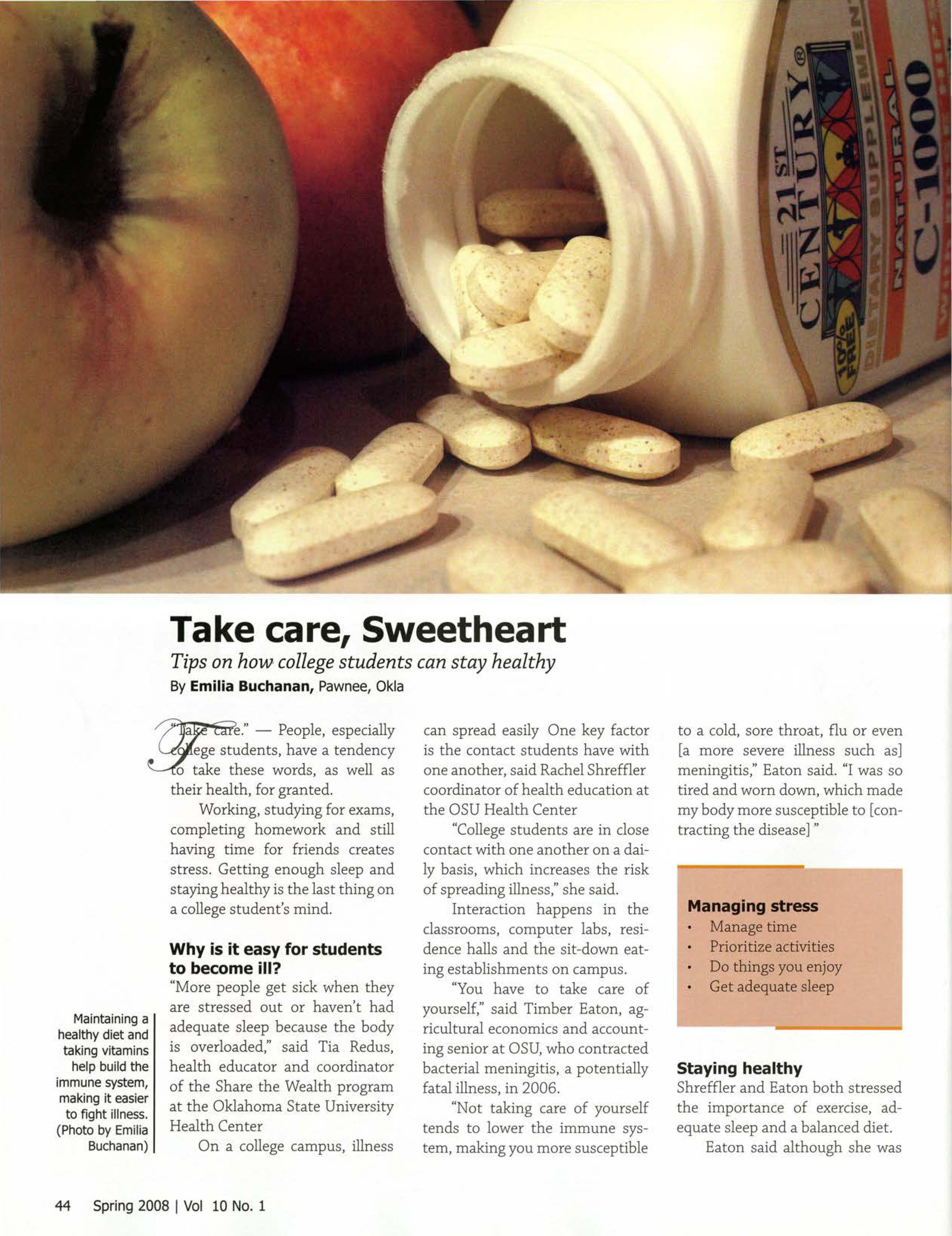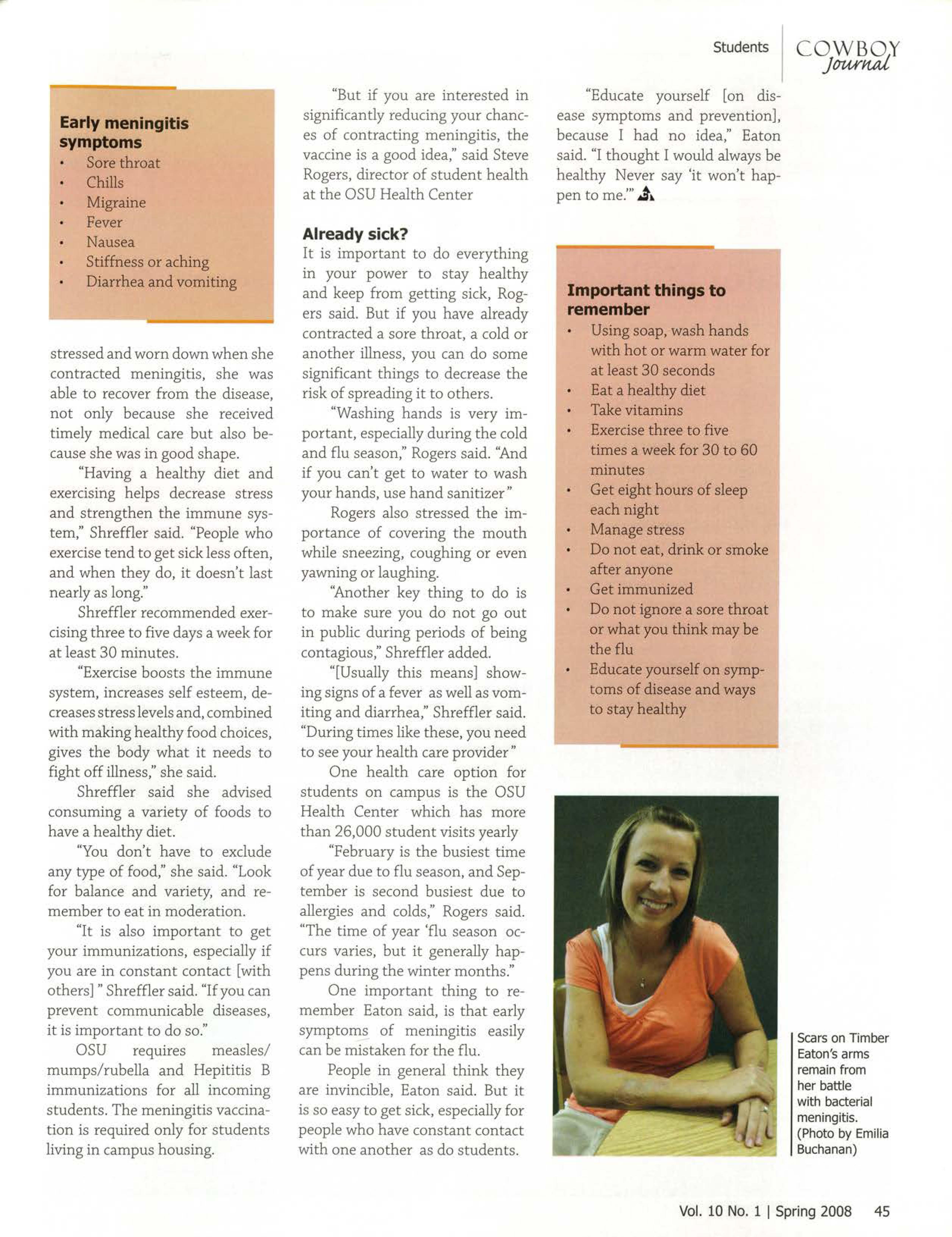 "You have to take care of yourself," said Timber Eaton, agricultural economics and accounting senior at OSU, who contracted bacterial meningitis, a potentially fatal illness, in 2006.