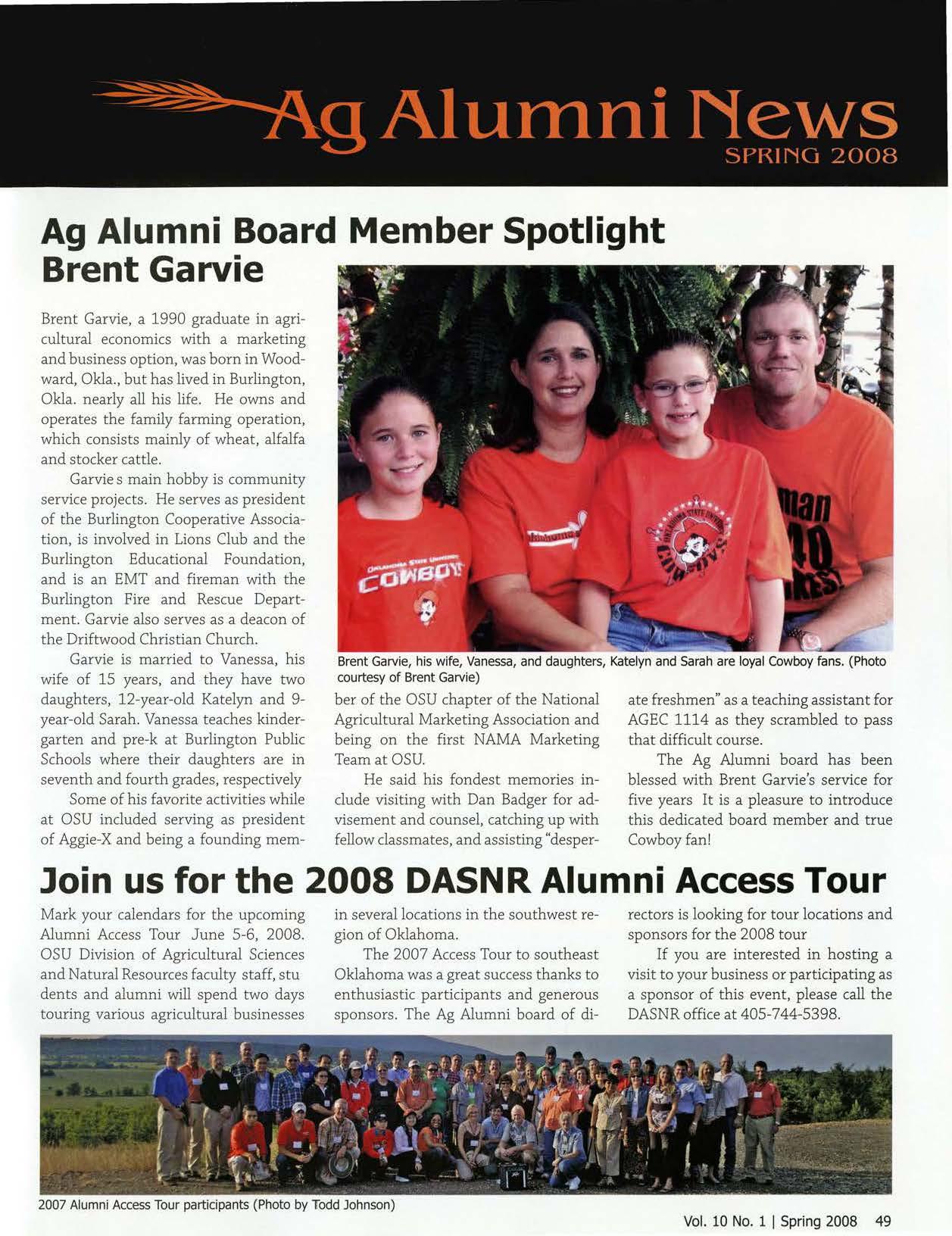 The Ag Alumni board has been blessed with Brent Garvie's service for five years It is a pleasure to introduce this dedicated board member and true Cowboy fan!