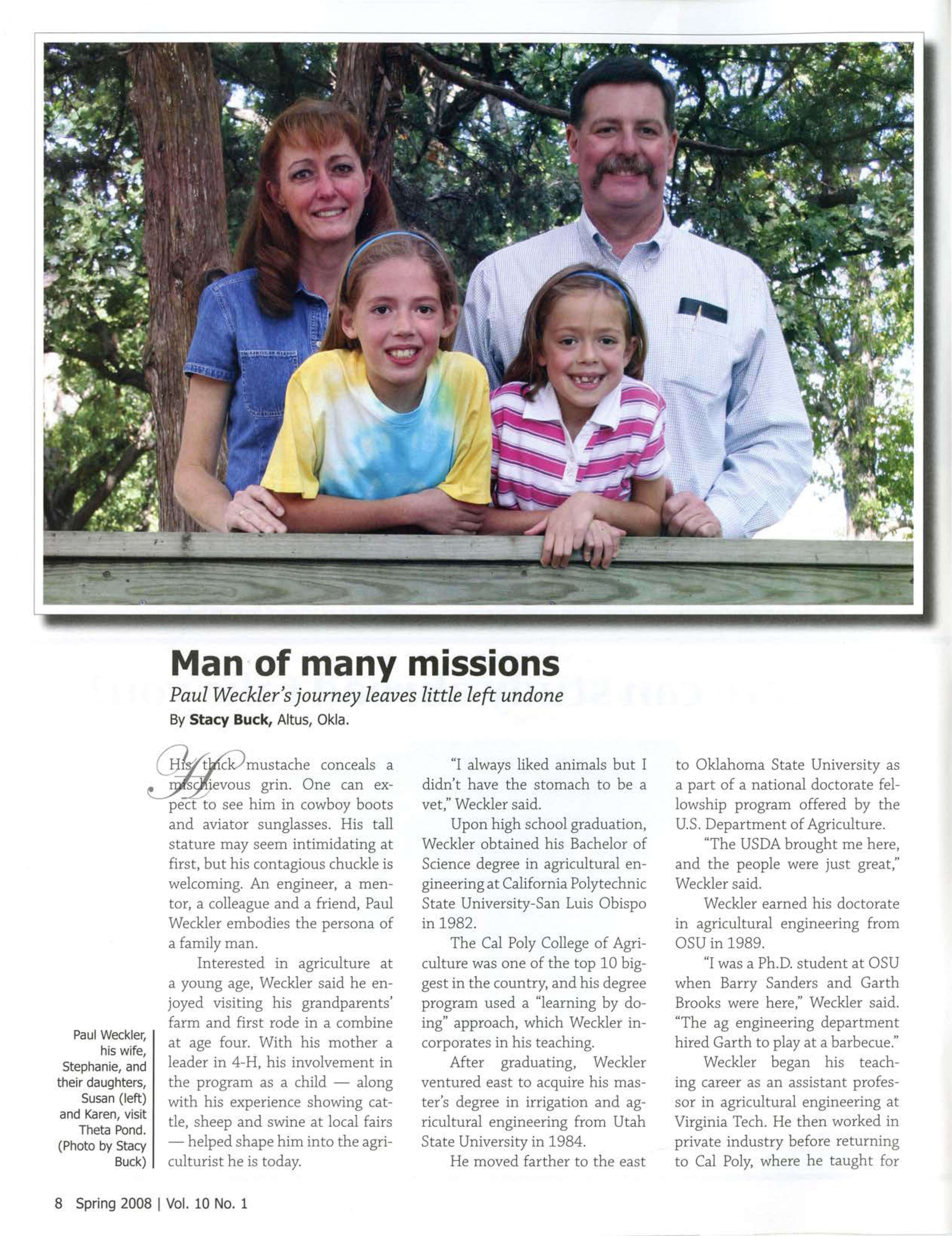 After graduating, Weckler ventured east to acquire his master's degree in irrigation and agricultural engineering from Utah State University in 1984.