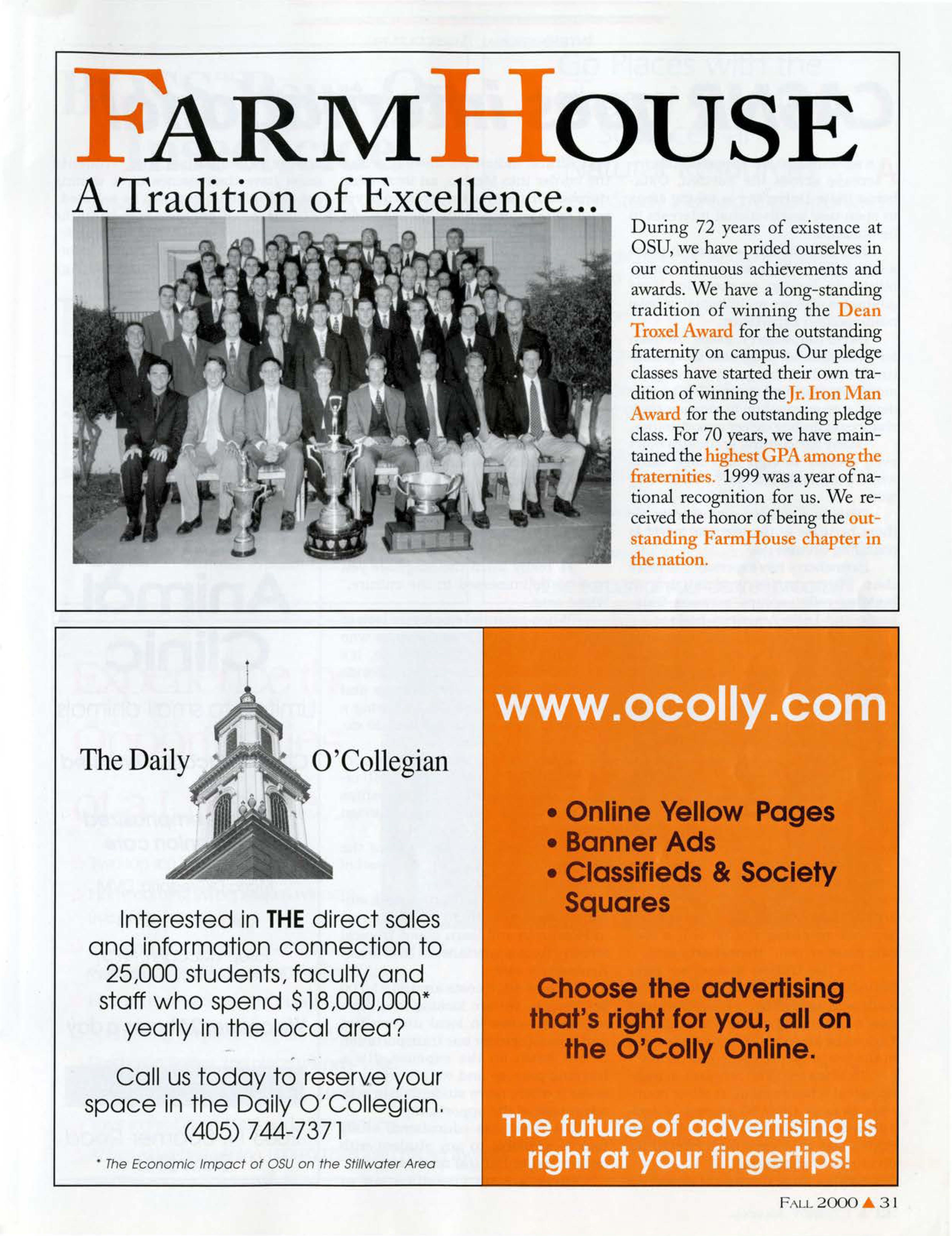 During 72 years of existence at OSU, we have prided ourselves in our continuous achievements and awards. We have a long-standing tradition of winning the Dean TroxelAwardfor the outstanding fraternity on campus. Our pledge classes have started their own tradition of winning the Jr. IronMan Awardfor the outstanding pledge class. For 70 years, we have maintained thehighestGPAamongthe fraternities.1999 was a year of national recognition for us. We received the honor of being the outstanding Fann.House chapter in the nation.
