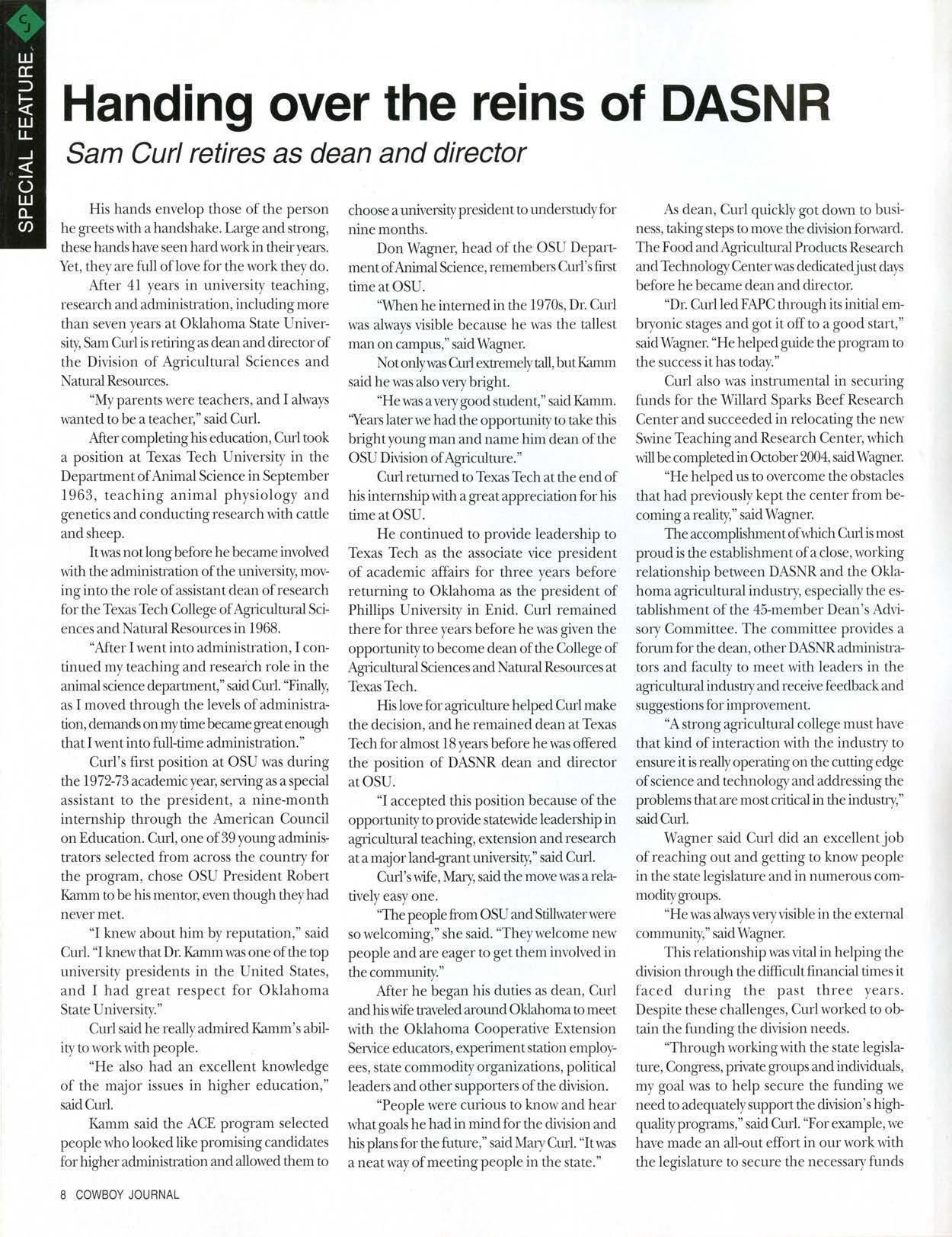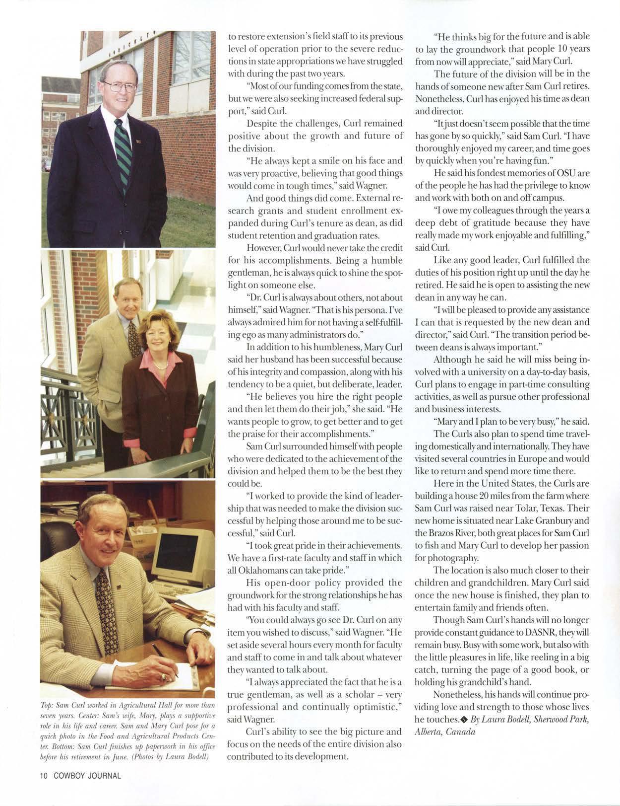 After 41 years in uni,·ersity teaching, research and administration, including more than seven years al Oklahoma State University,SamCurl isreti1ingas dean and director of the Division of Agricultural Sciences and NaniralResources.