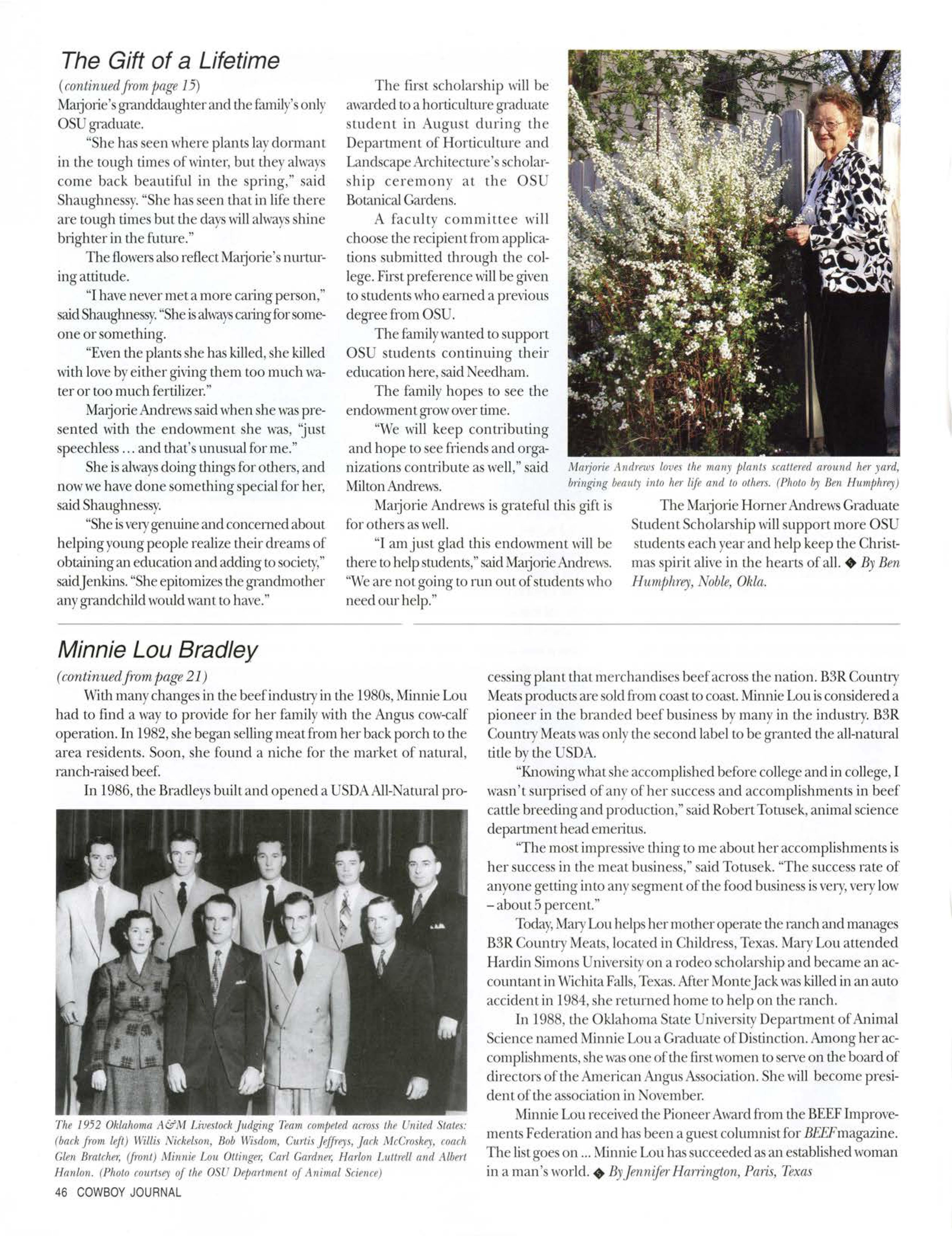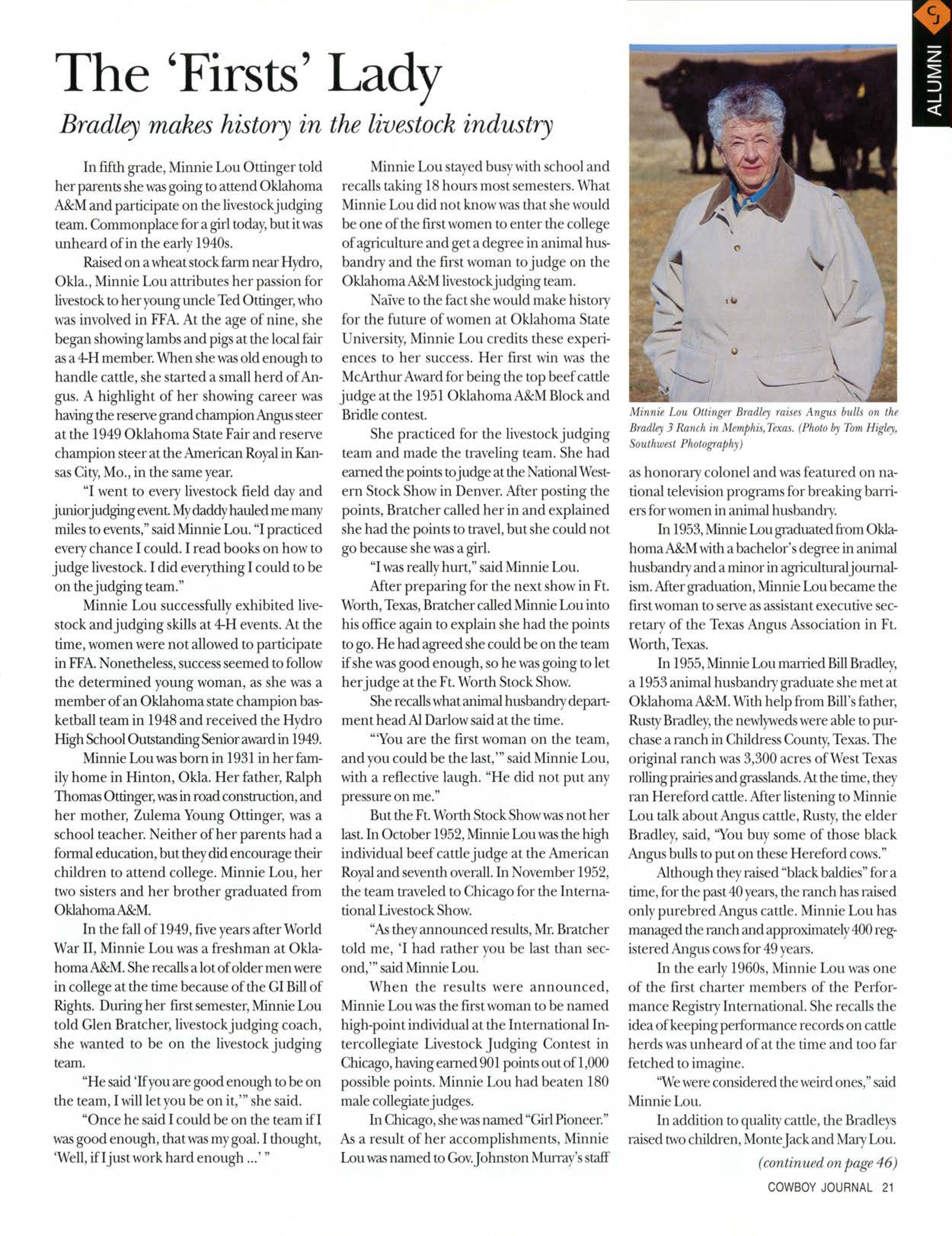In 198 the Oklahoma tate niver ity Deparunent of nimal cience named Minnie Lou a Graduate of Di unction. Among her accompli hments, he 11 ne oftJ1efirstwomen to erveon tJ1eboard of directors of tJ1eAmerican ngu Association.She will b come pre idem of tJ1ea ociation in November.