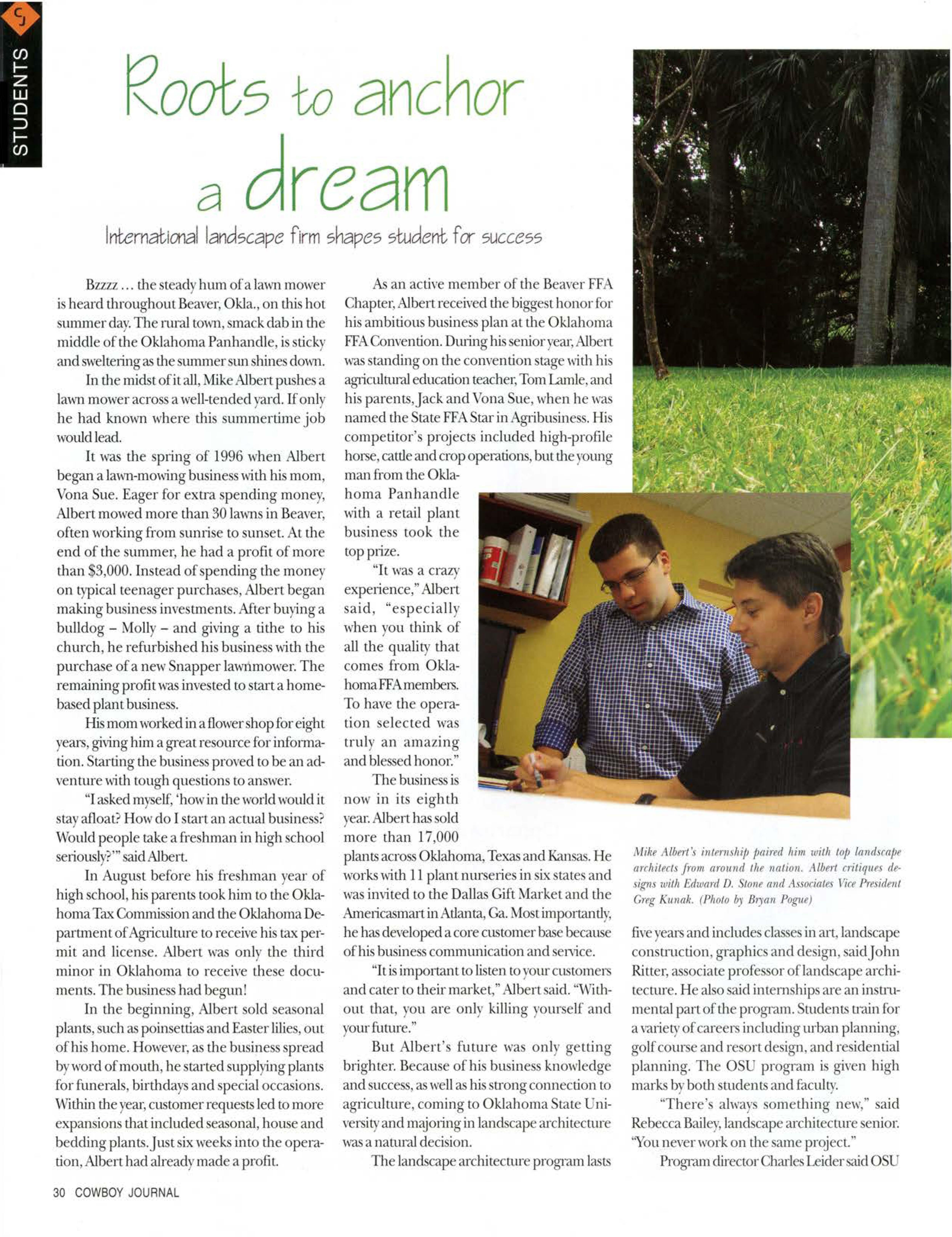 Alben is a young man grounded in his agiicultw-alrootsbut dreamingbig and achieving his goals.He illusu-atesdiat a boyfrom die OklahomaPanhandlecan be a successthrough hard workand sacrificecombined 1,~d1 a constant enthusiasmfor life.Whilehe speaksabout landscape architecture, his lessons apply to e\'e11'one.