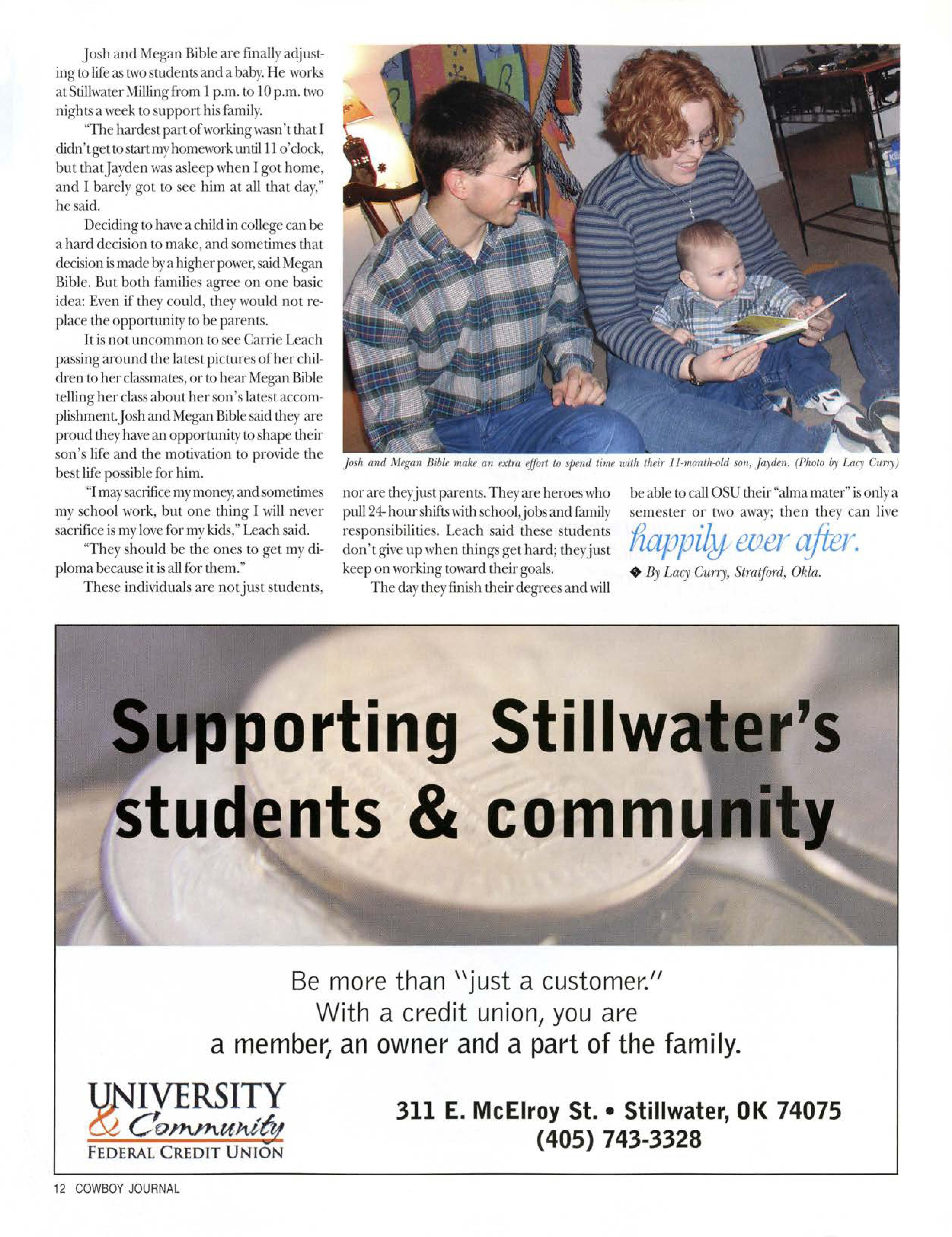Having one parent in school can be a sourceof physicaland financialstres.sfor a family.But when both parents attend school full Lime,new challenges arise.Josh and Megan Bible,both 22, attend classesat OSU and have an l l-month-0ldson,Jayden.